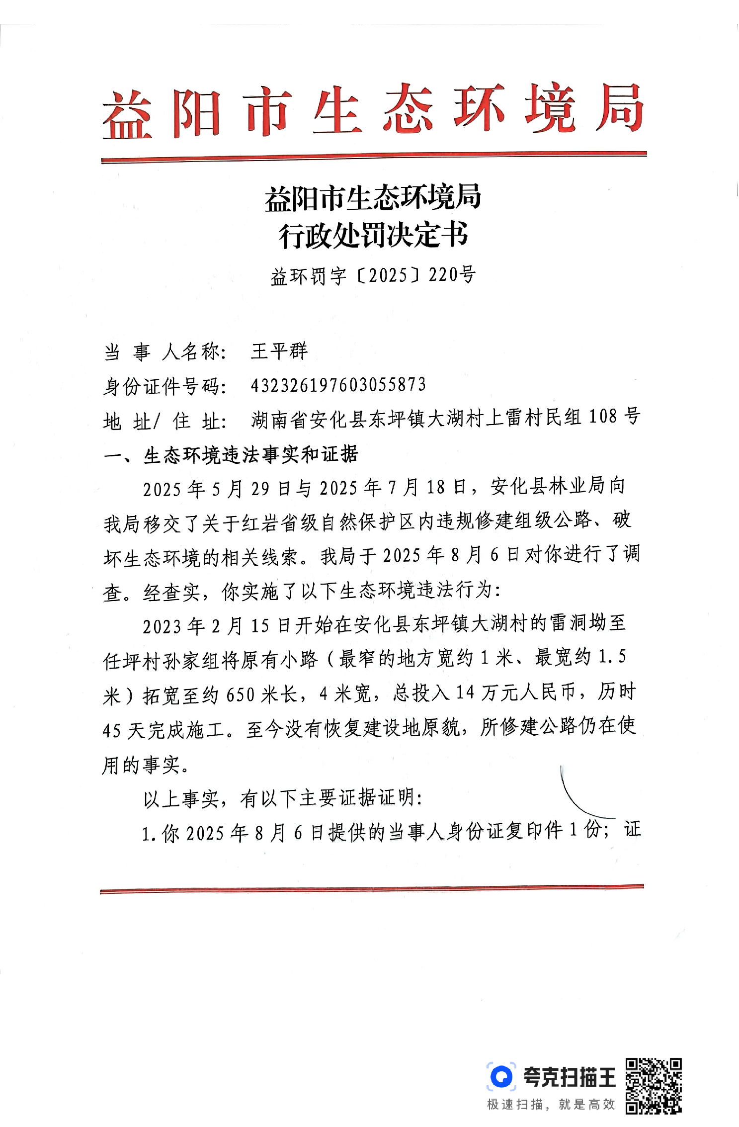 行政处罚决定书 益环罚字【2025】220号 王平群