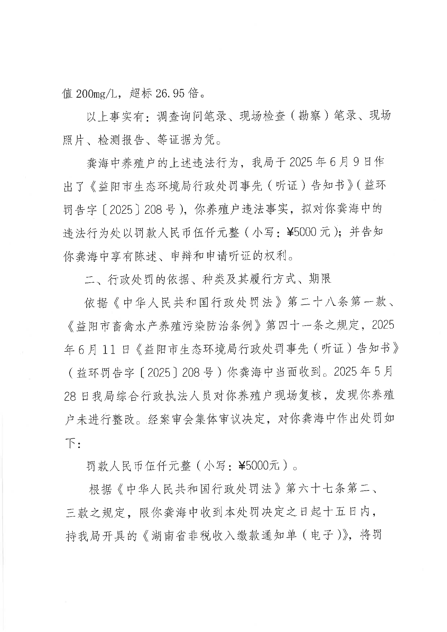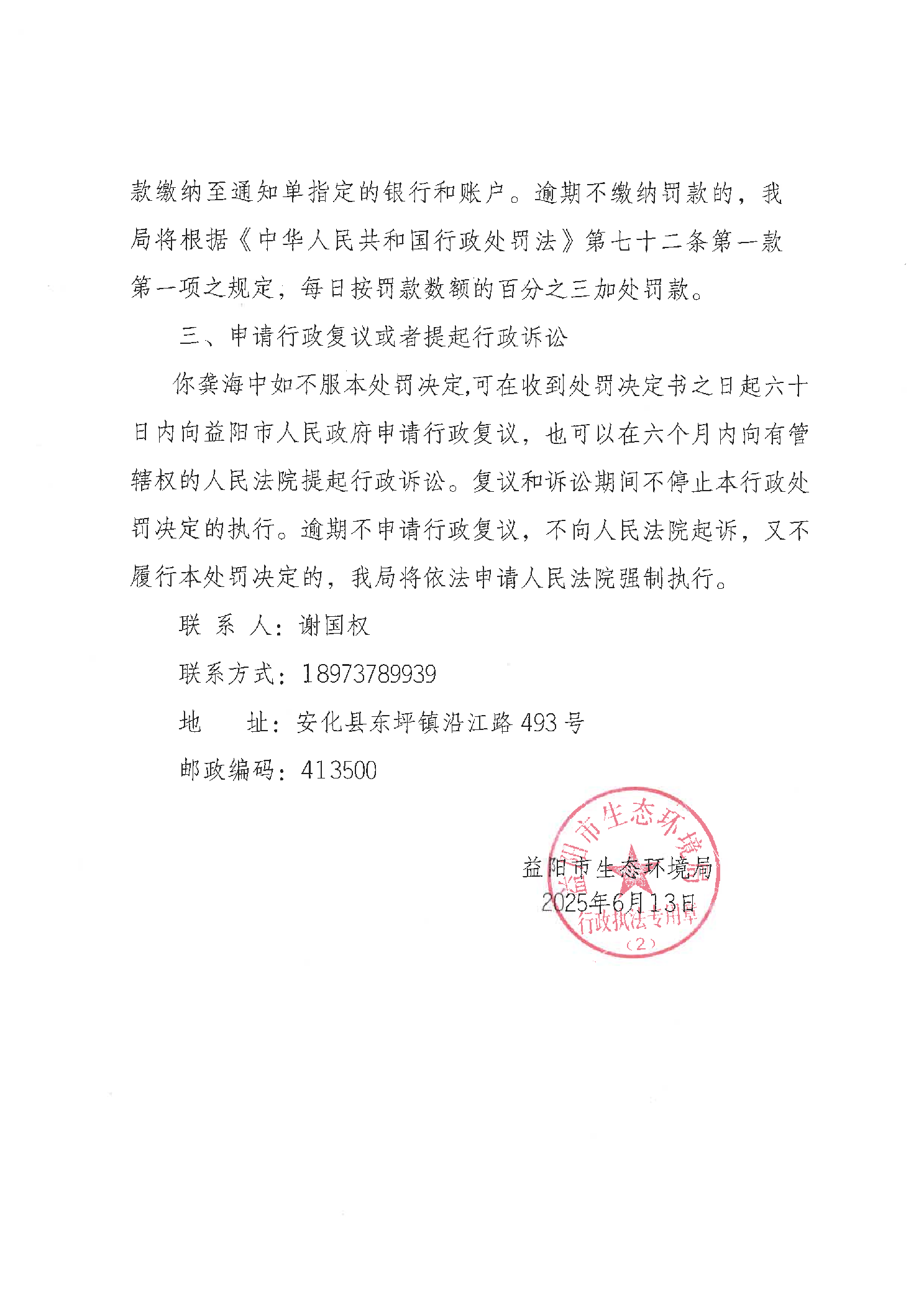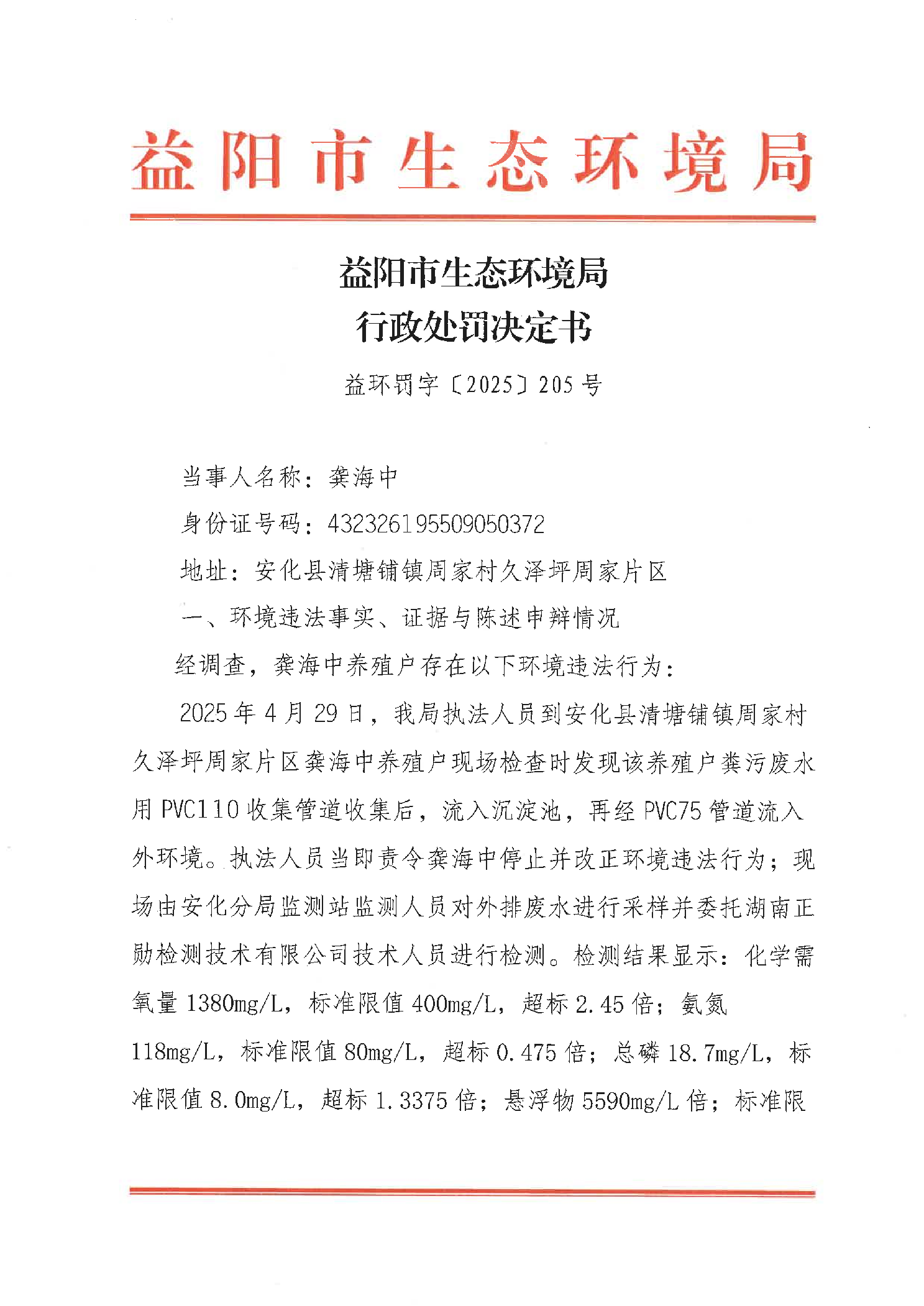 行政处罚决定书 益环罚字【2025】205号 龚海中