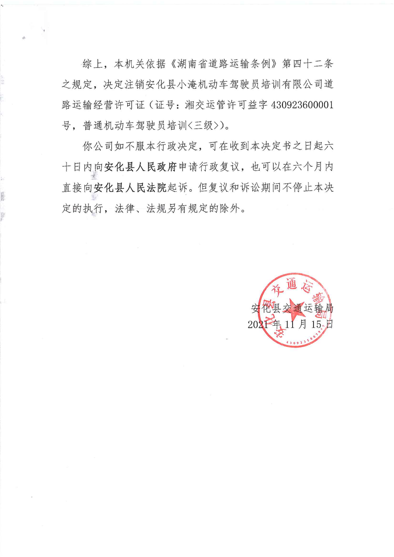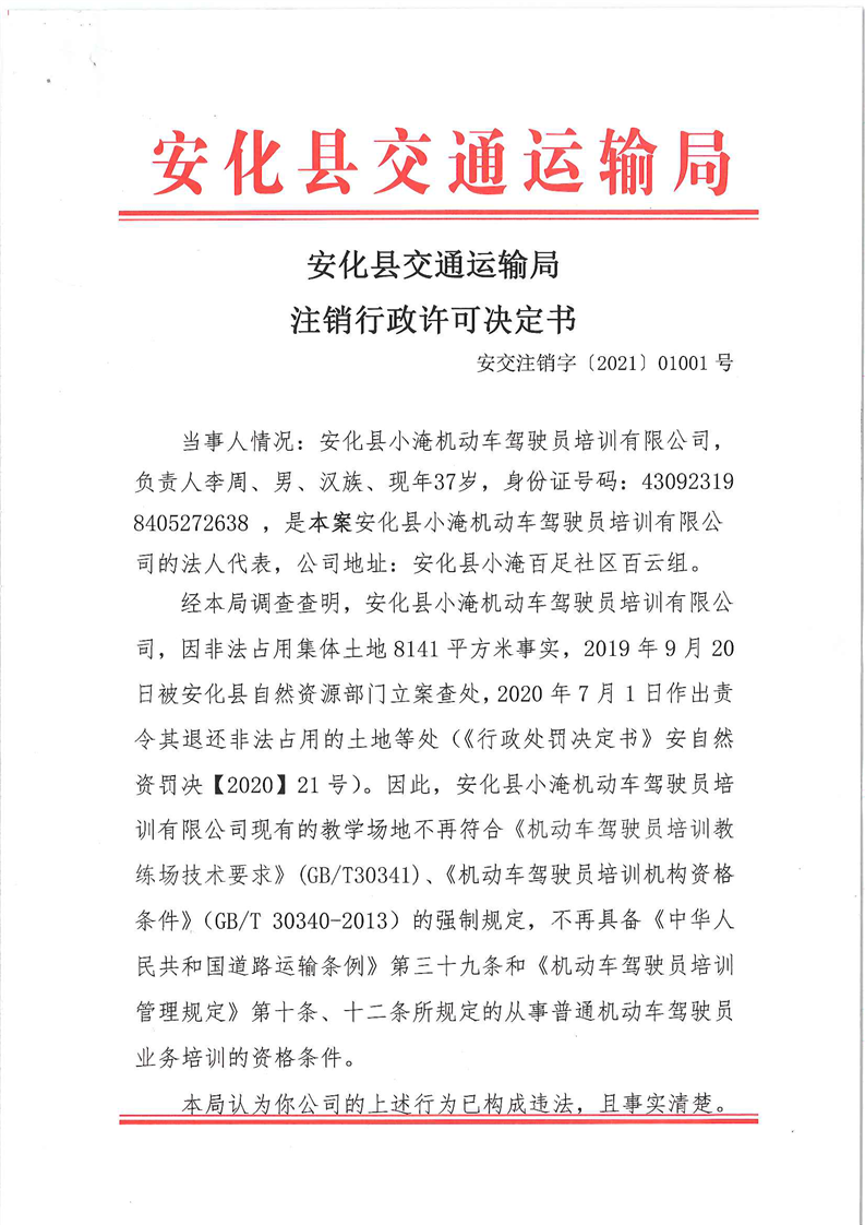 安化县交通运输局注销行政许可决定书 安交注销字〔2021〕01001号