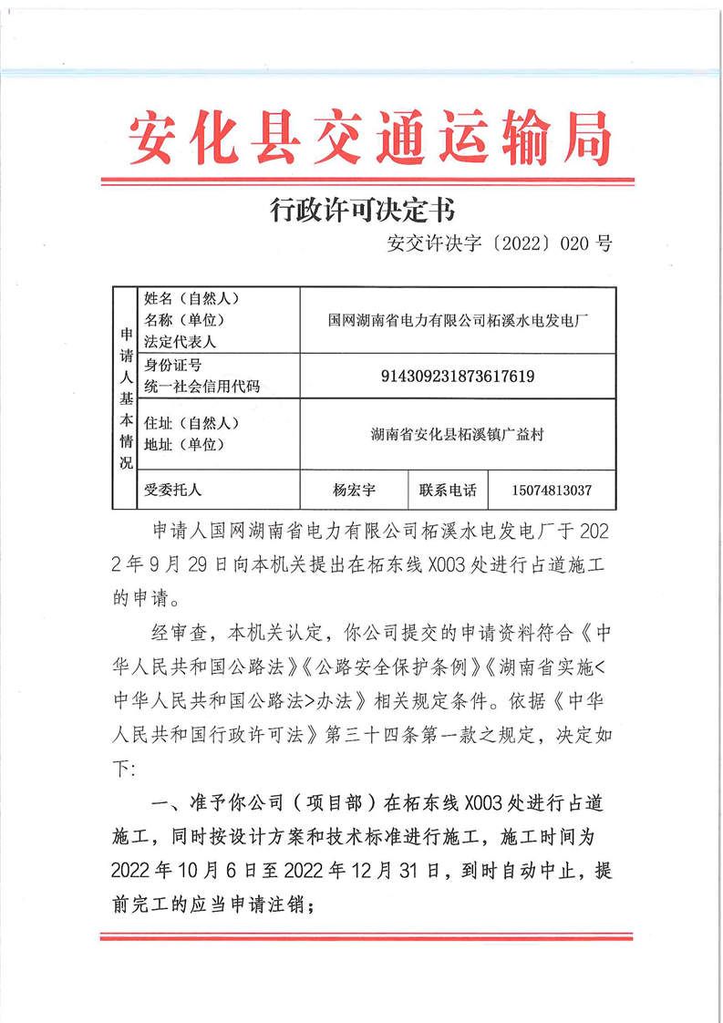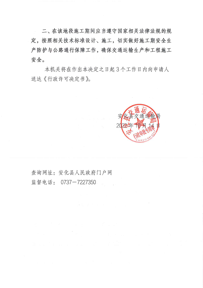 安化县交通运输局行政许可决定书 安交许决字【2022】020号