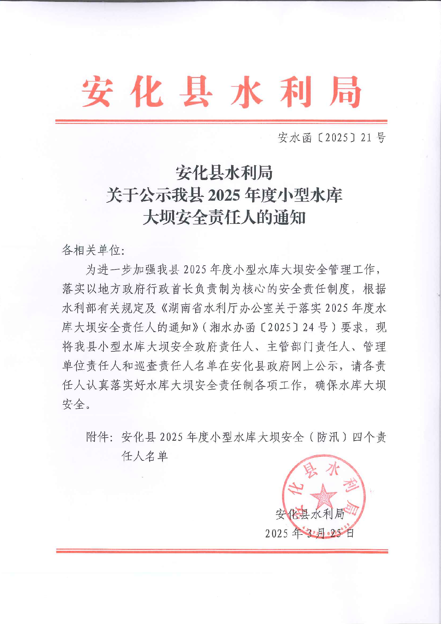 关于公示我县2025年度小型水库大坝安全责任人的通知