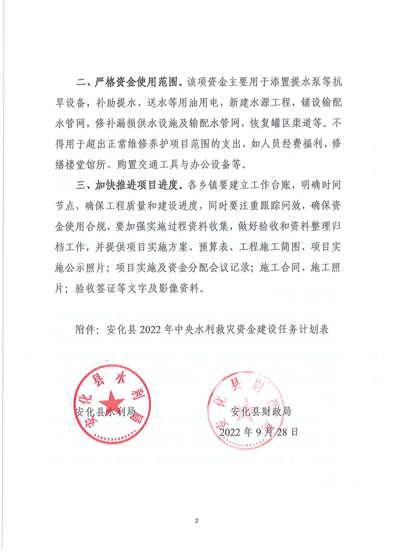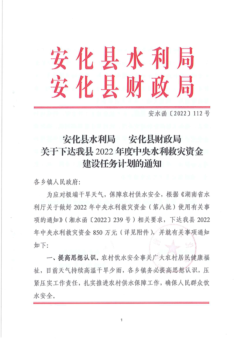 _安水函〔2022〕112号 关于下达我县2022年度中央水利救灾资金建设任务计划的通知(安化县水利局 安化县财政局)