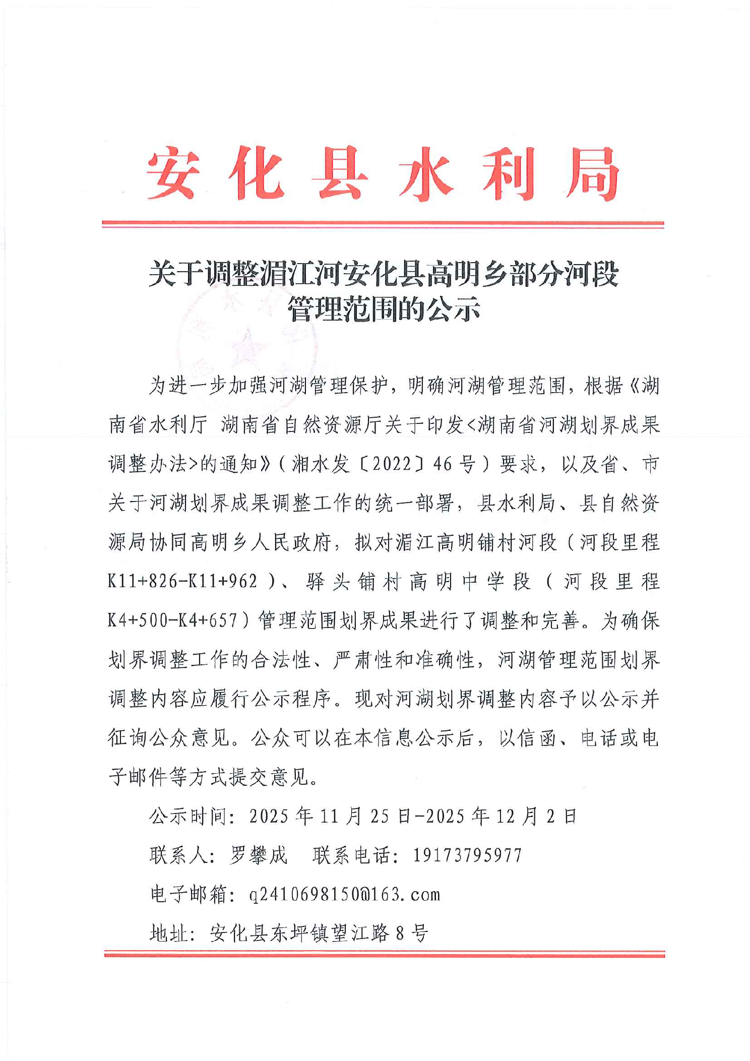关于调整湄江河安化县高明乡部分河段管理范围的公示