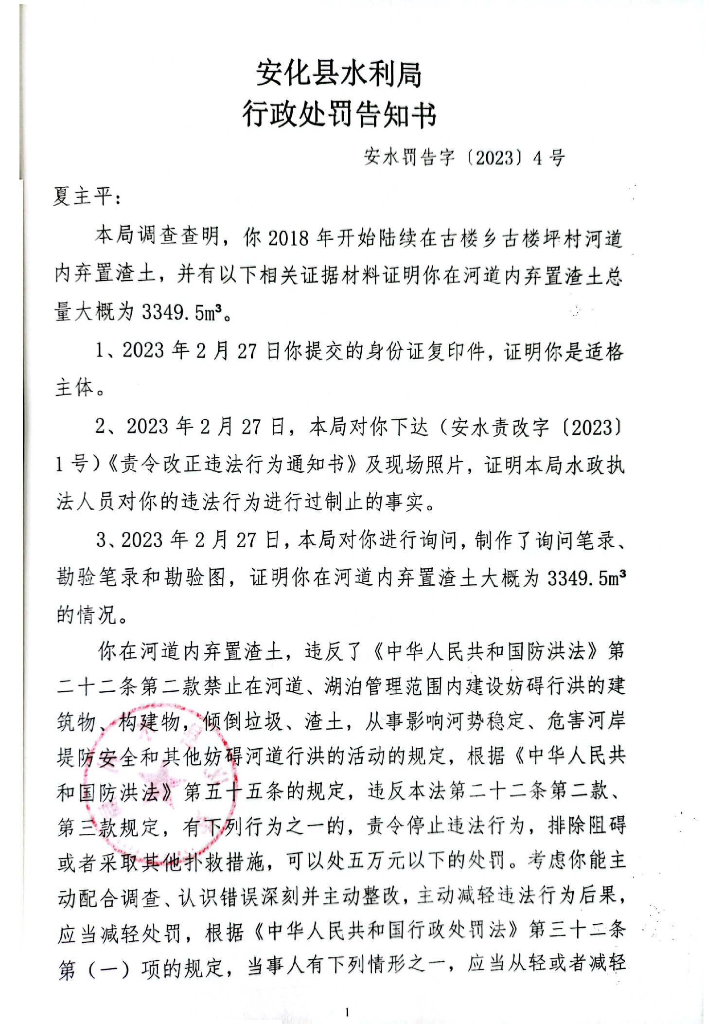 安水罚字(2023)4号古楼乡古楼坪段河道内弃置渣土