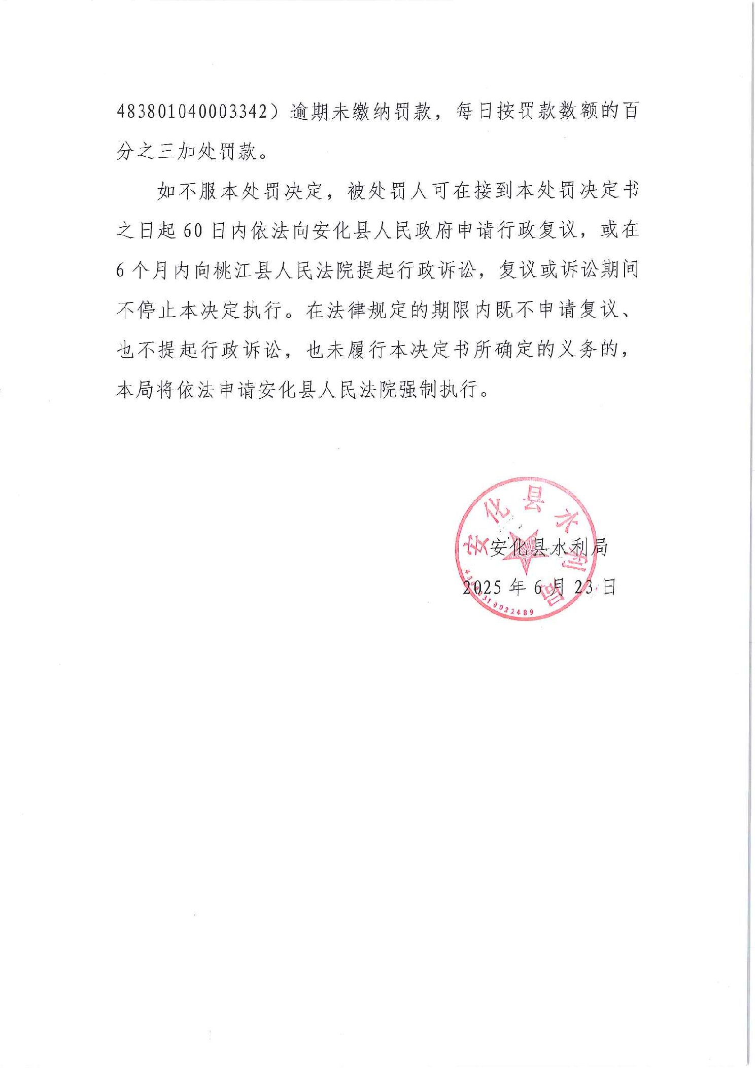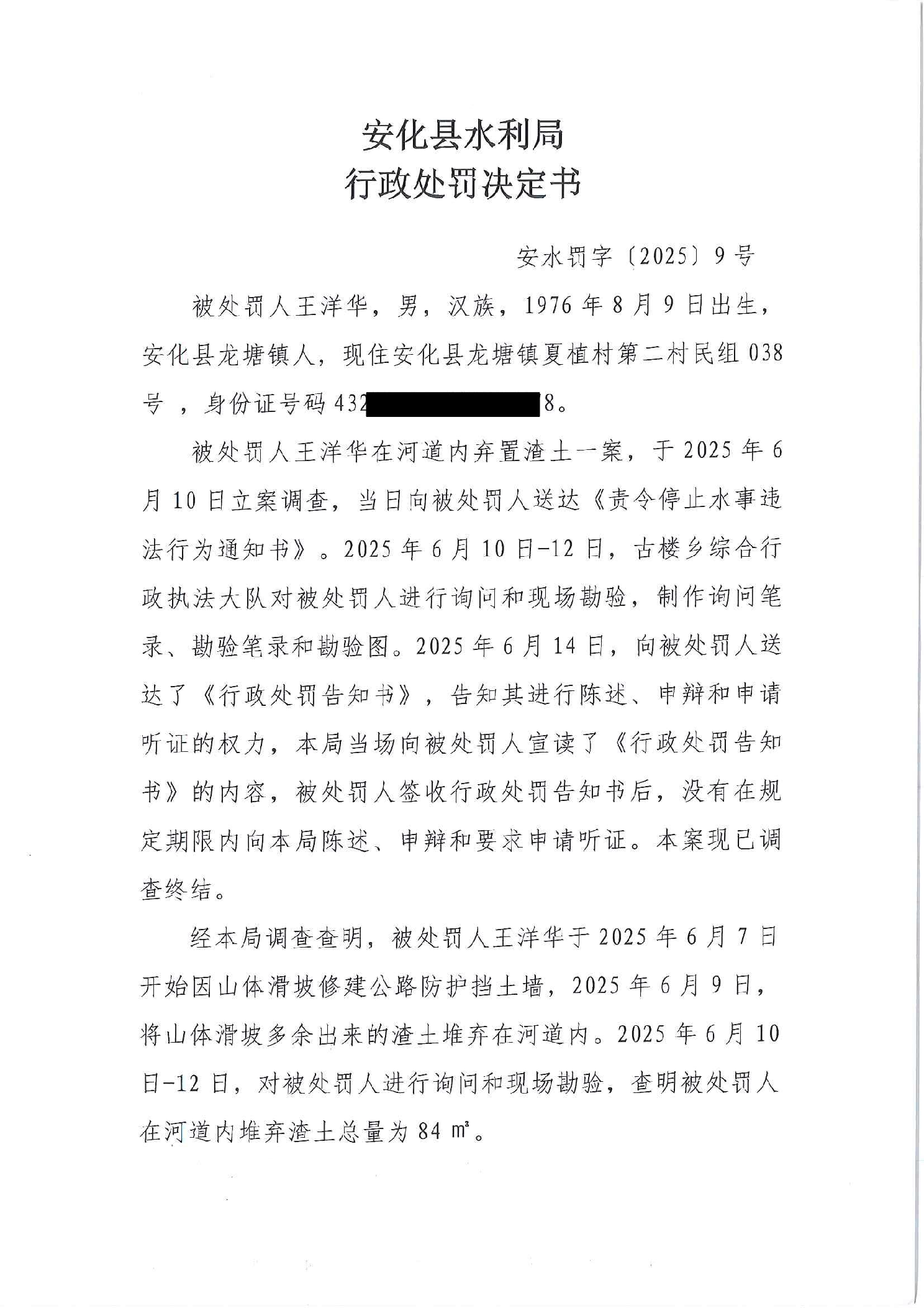 安化县水利局行政处罚决定书 安水罚字(2025)9号