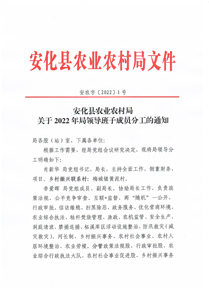 安化县农业农村局关于2022年局领导班子成员分工的通知