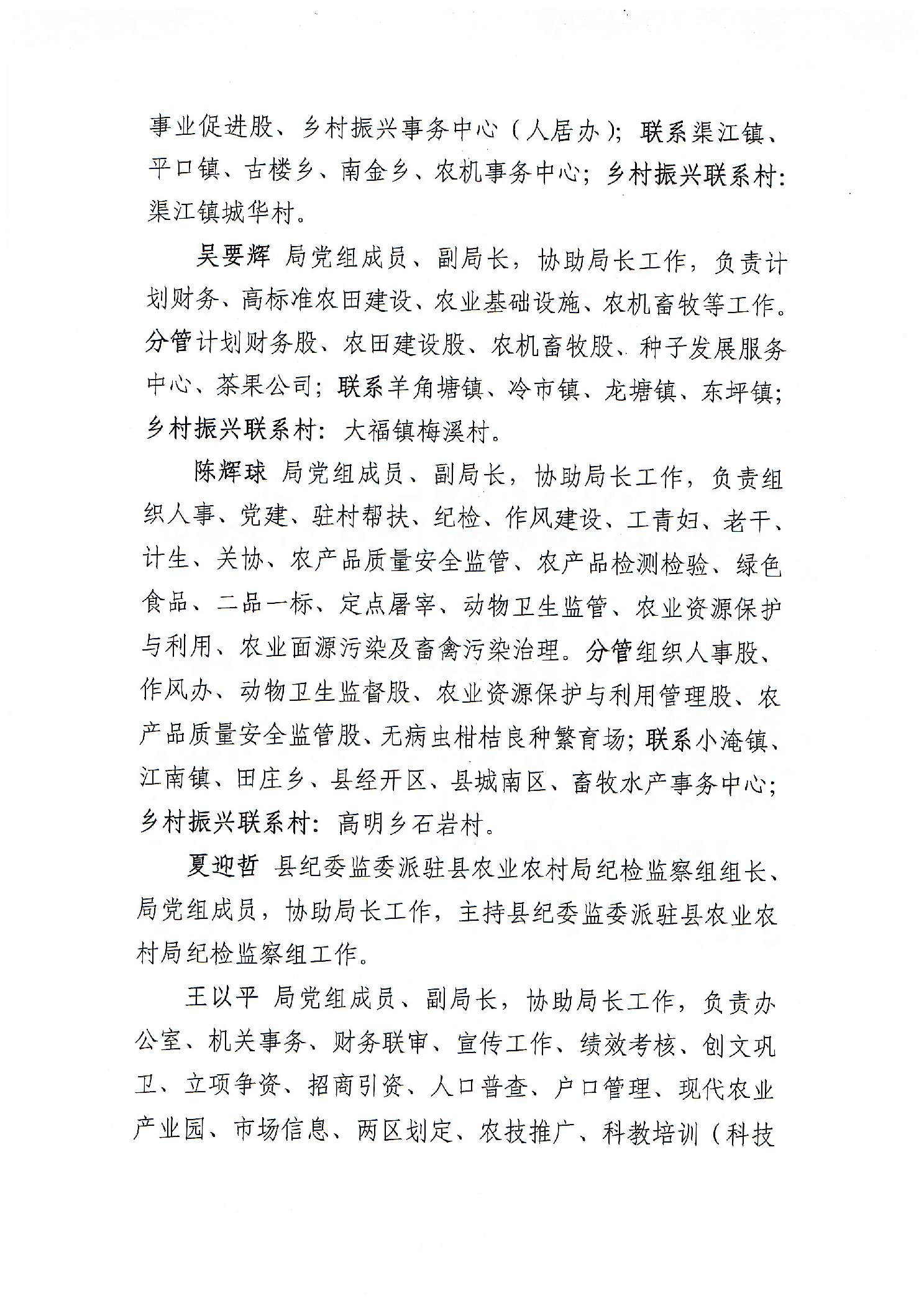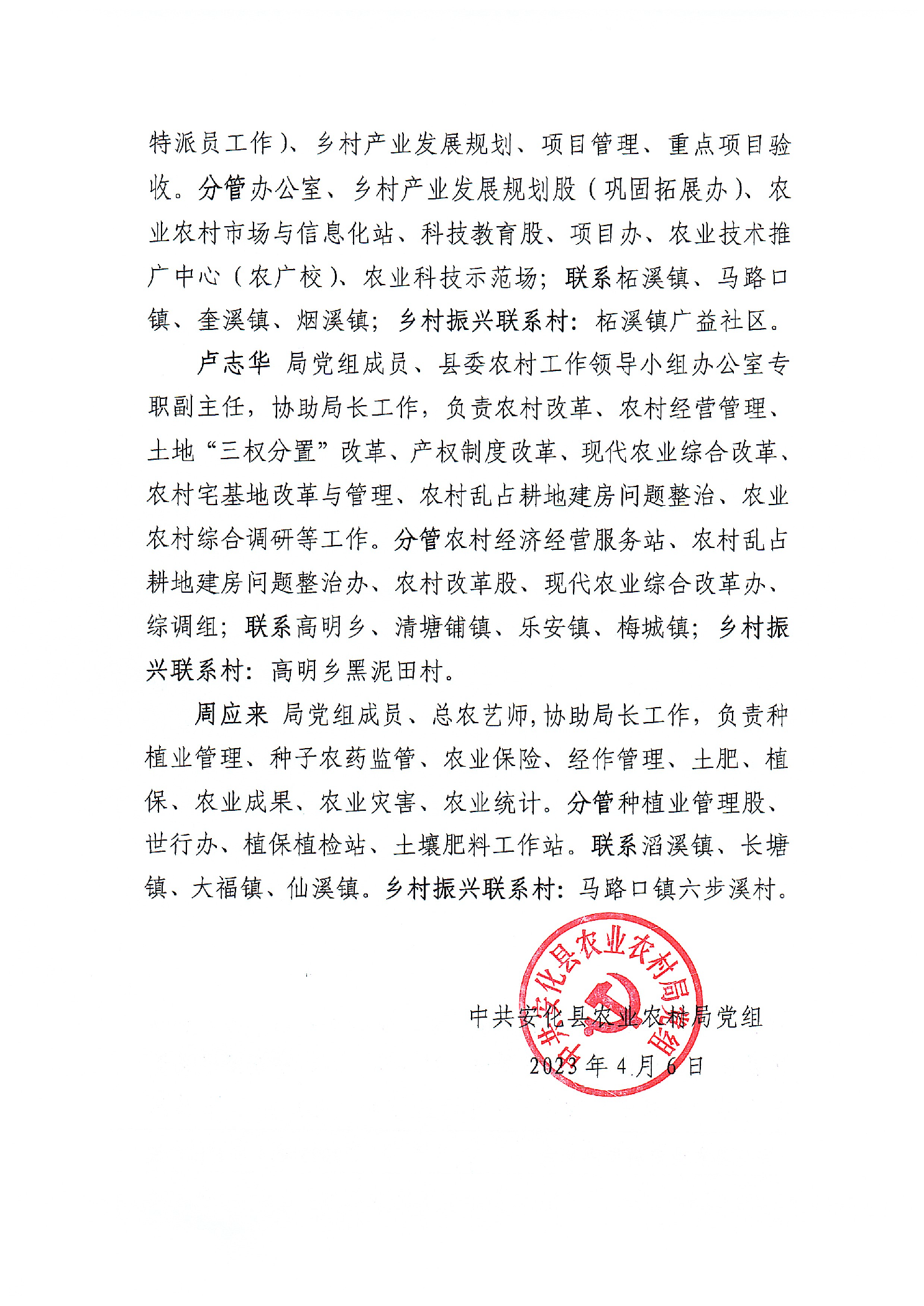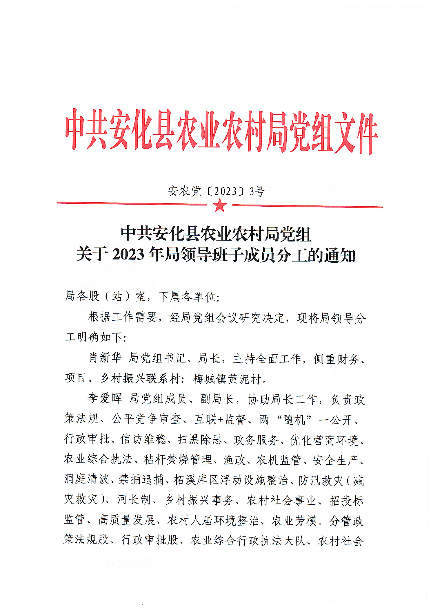 中共安化县农业农村局局党组关于2023年局领导班子成员分工的通知