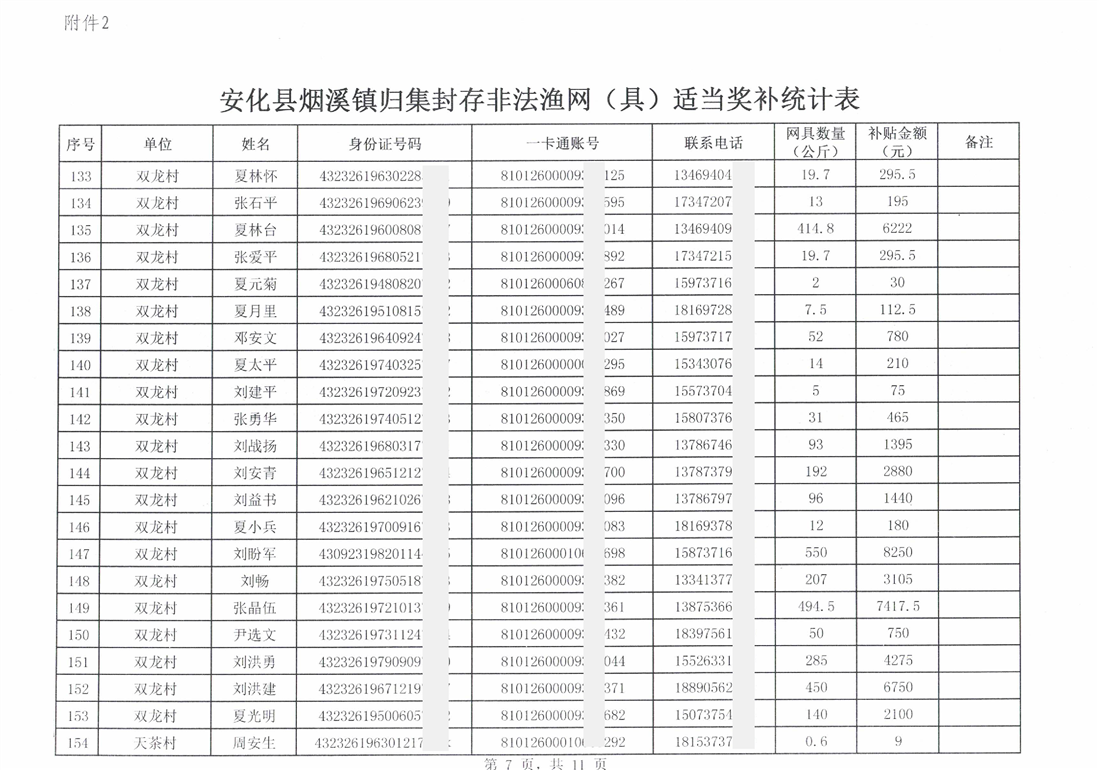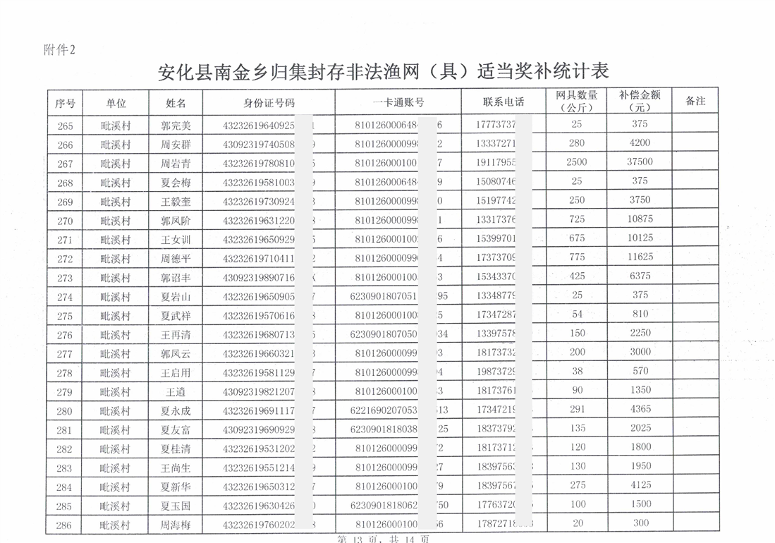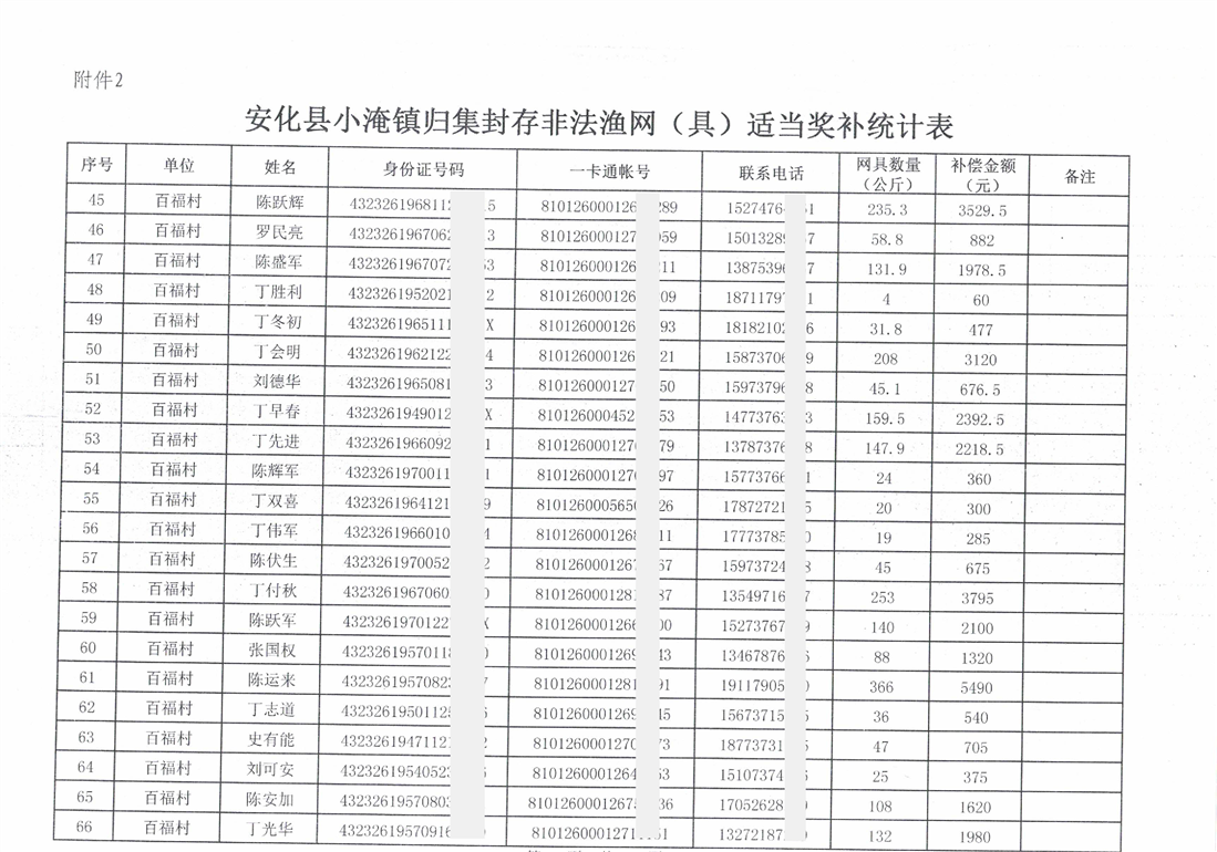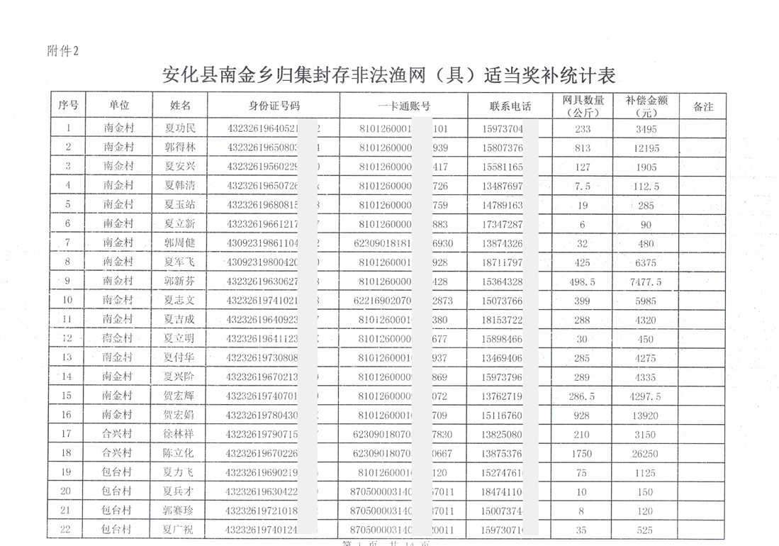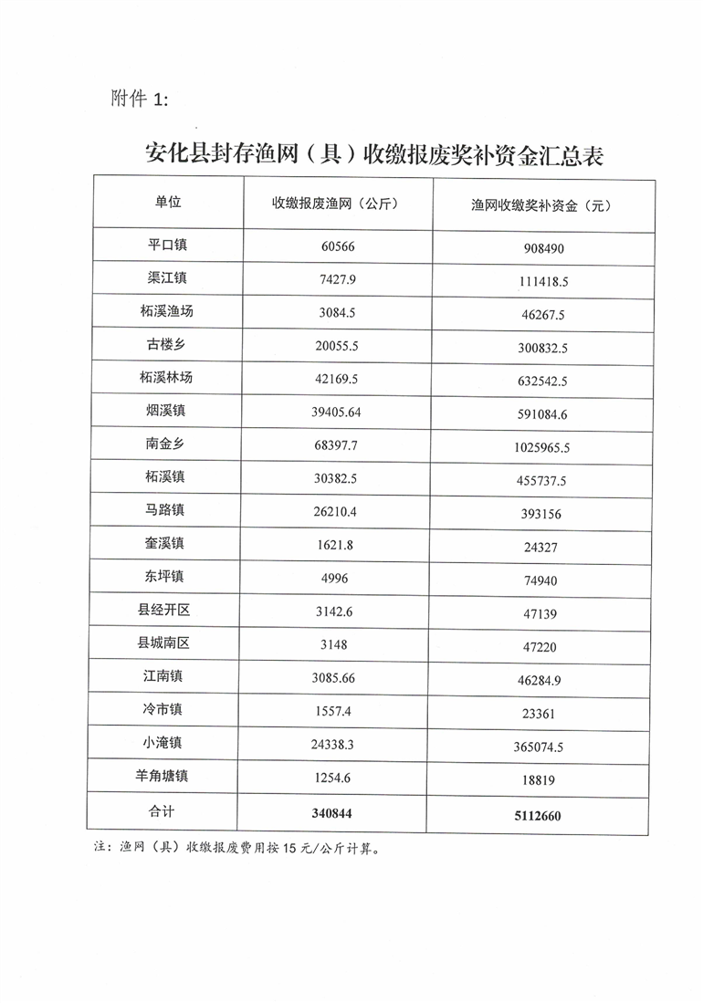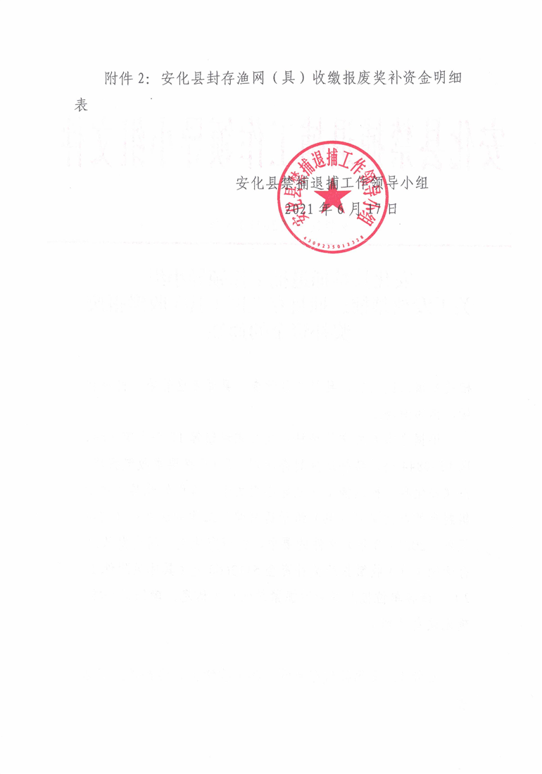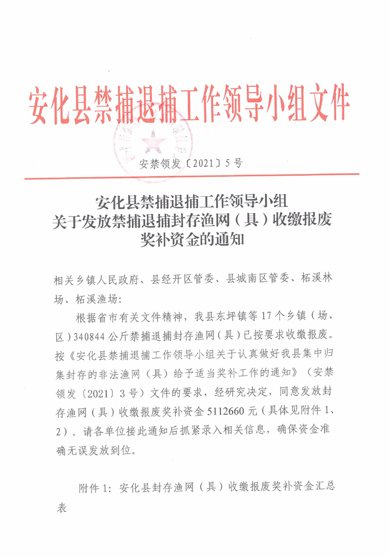 安化县禁捕退捕工作领导小组关于发放禁捕退捕封存渔网(具)收缴报废奖补资金的通知