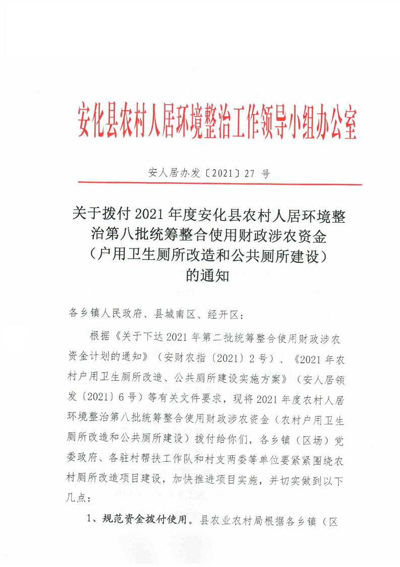关于拨付2021年度安化县农村人居环境整治第八批统筹整合使用财政涉农资金(户用卫生厕所改造和公共厕所建设)的通知