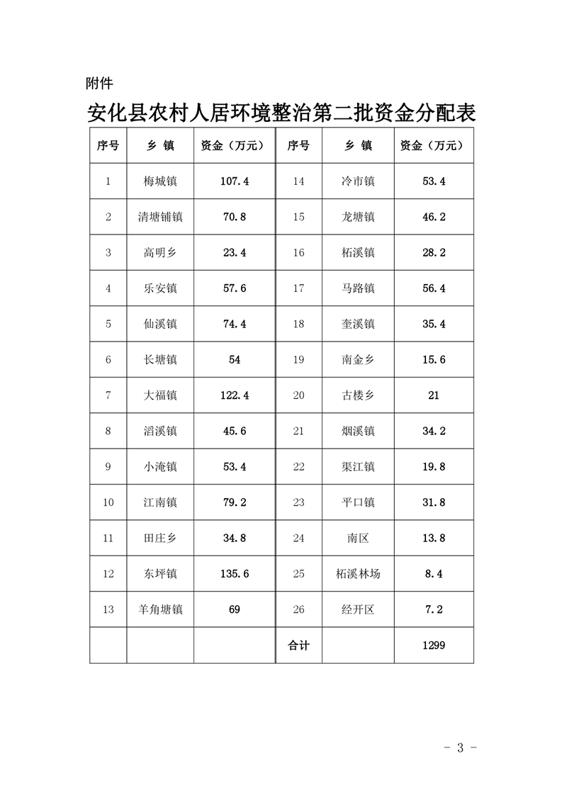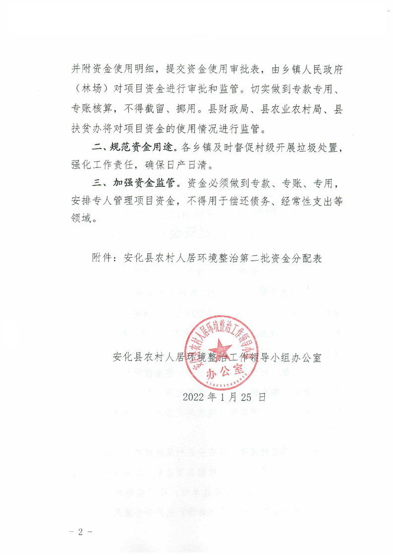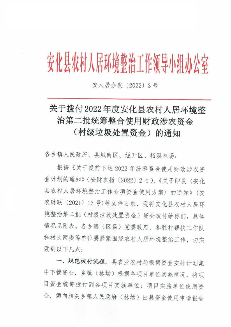 关于拨付2022年度安化县农村人居环境整治第二批统筹整合使用财政涉农资金(村级垃圾处置资金)的通知