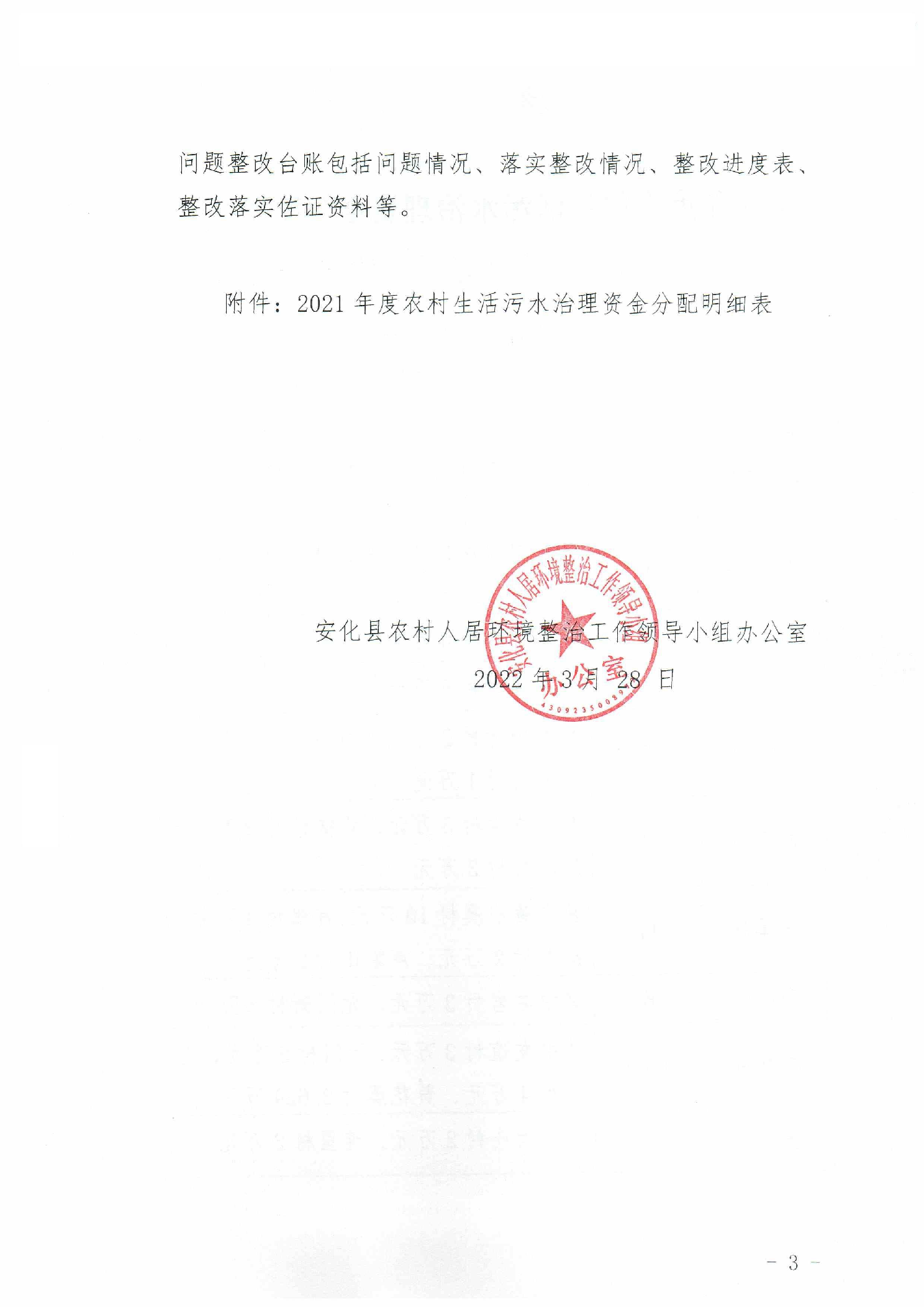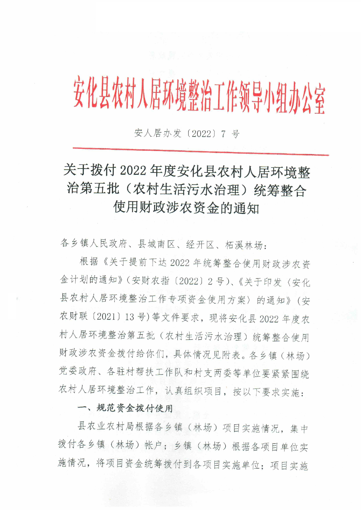 关于拨付2022年度安化县农村人居环境整治第五批(农村生活污水治理)统筹整合使用财政涉农资金的通知