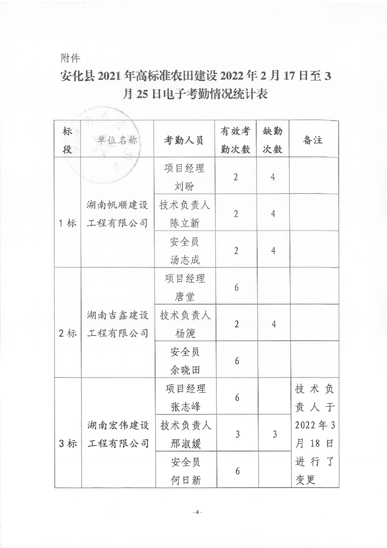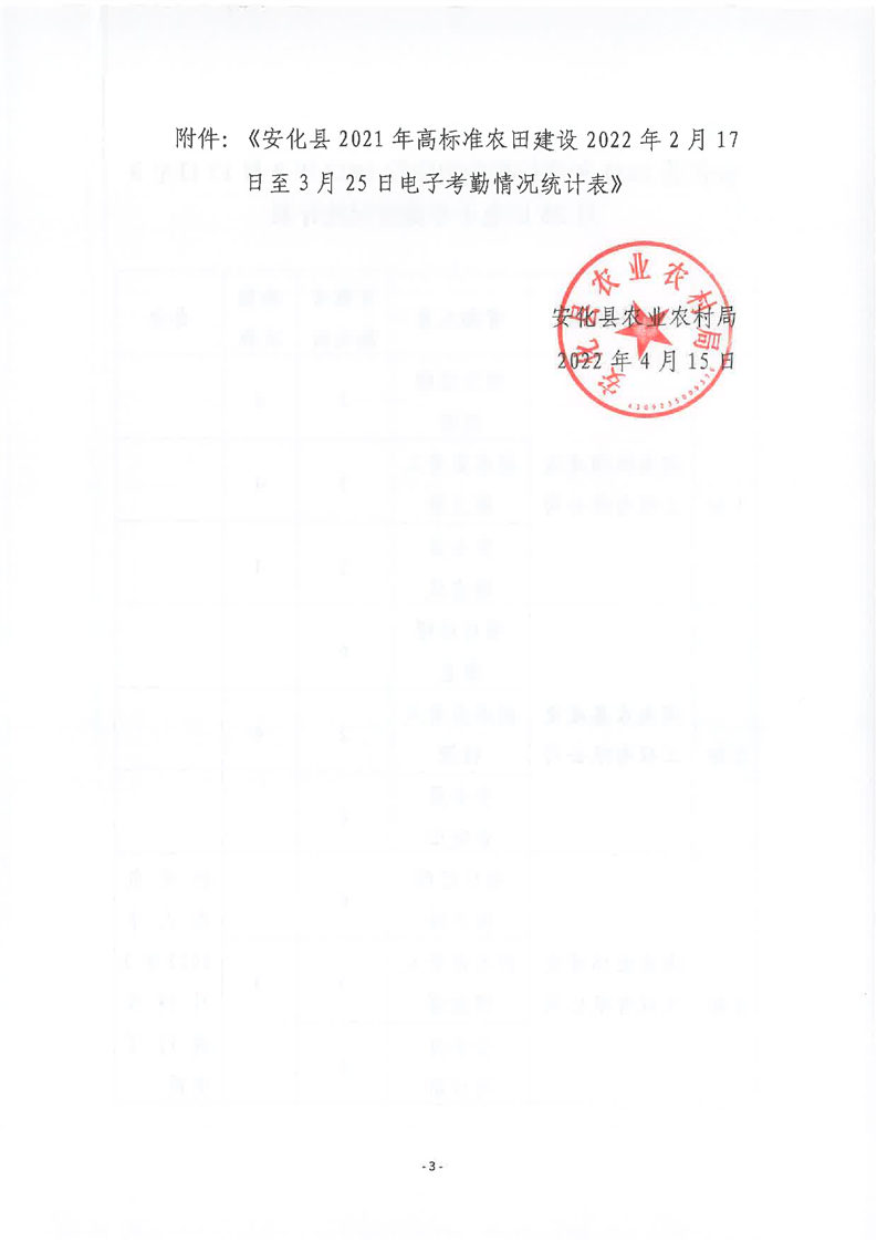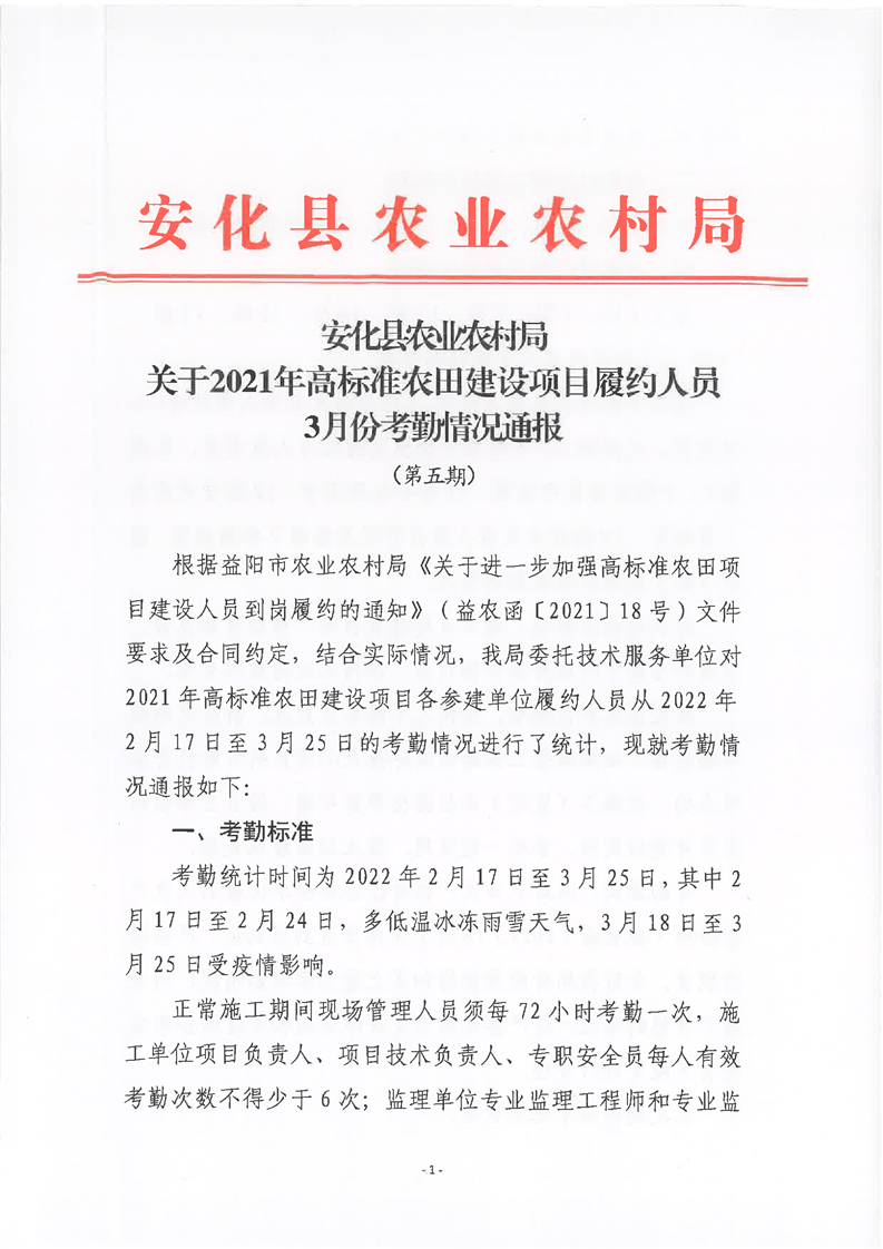 安化县农业农村局关于2021年高标准农田建设项目履约人员3月份考勤情况通报(第五期)