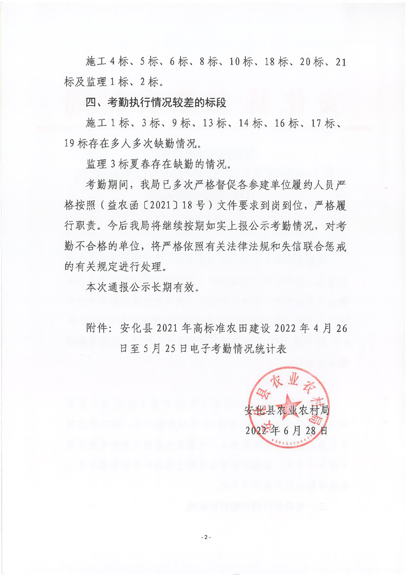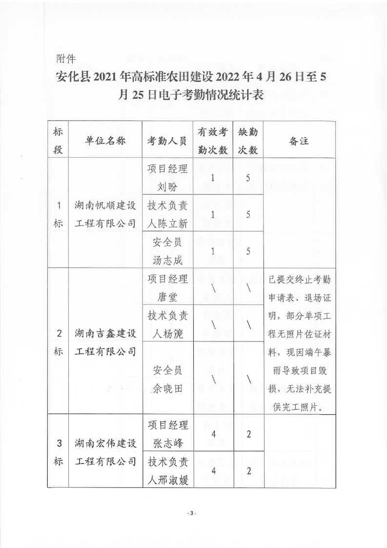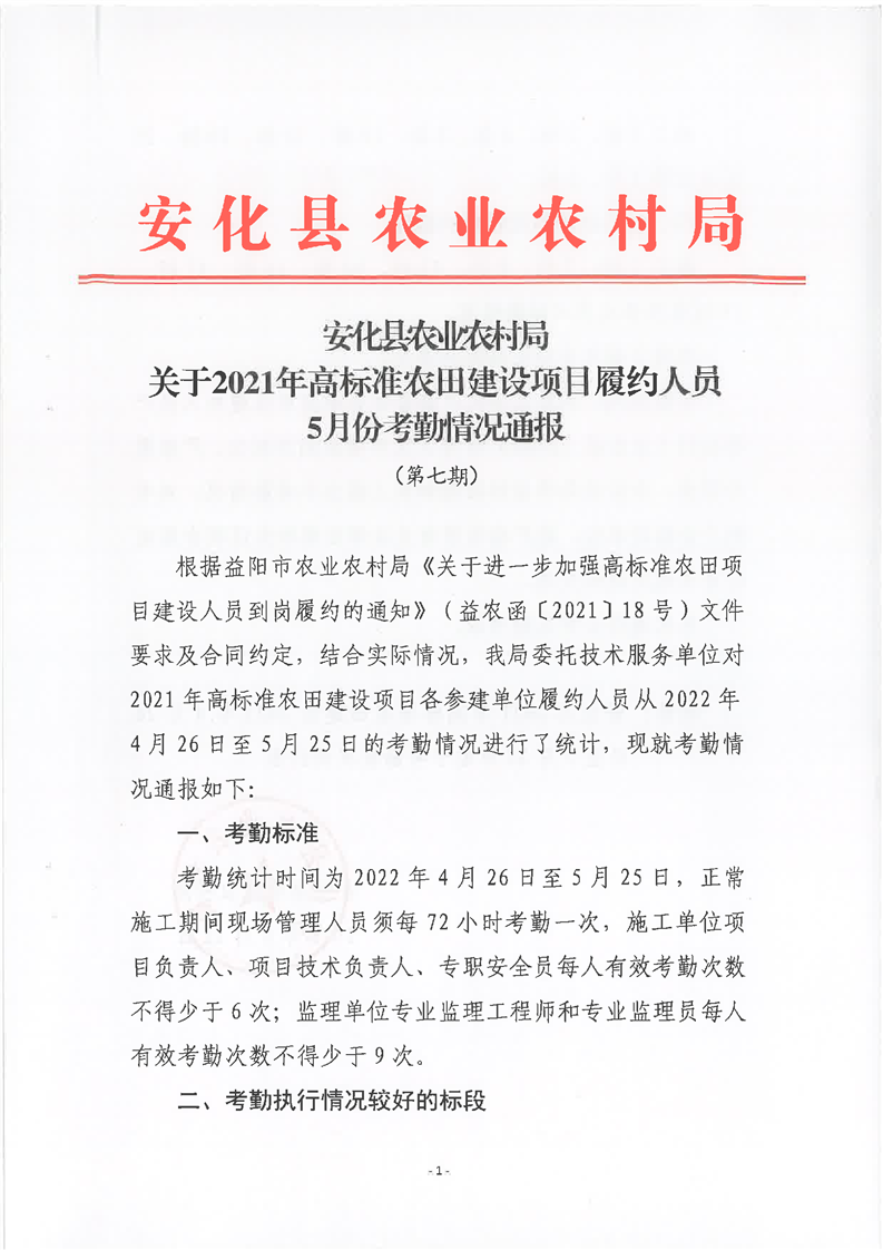 安化县农业农村局关于2021年高标准农田建设项目履约人员5月份考勤情况通报