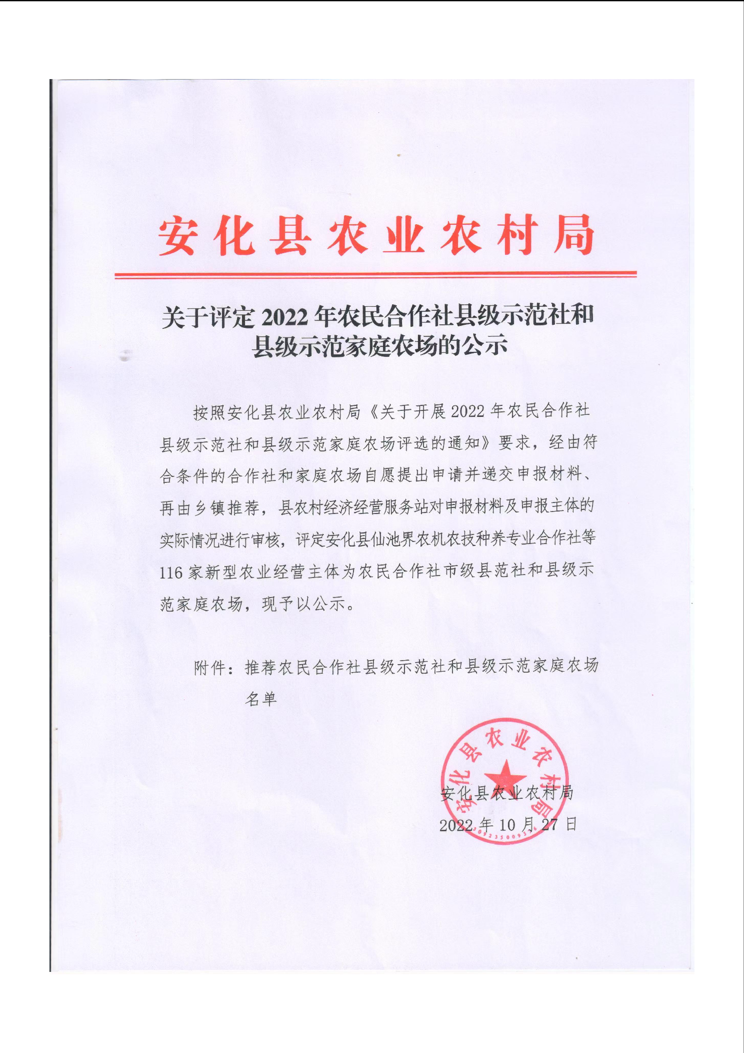 关于评定2022年农民合作社县级示范社和县级示范家庭农场的公示