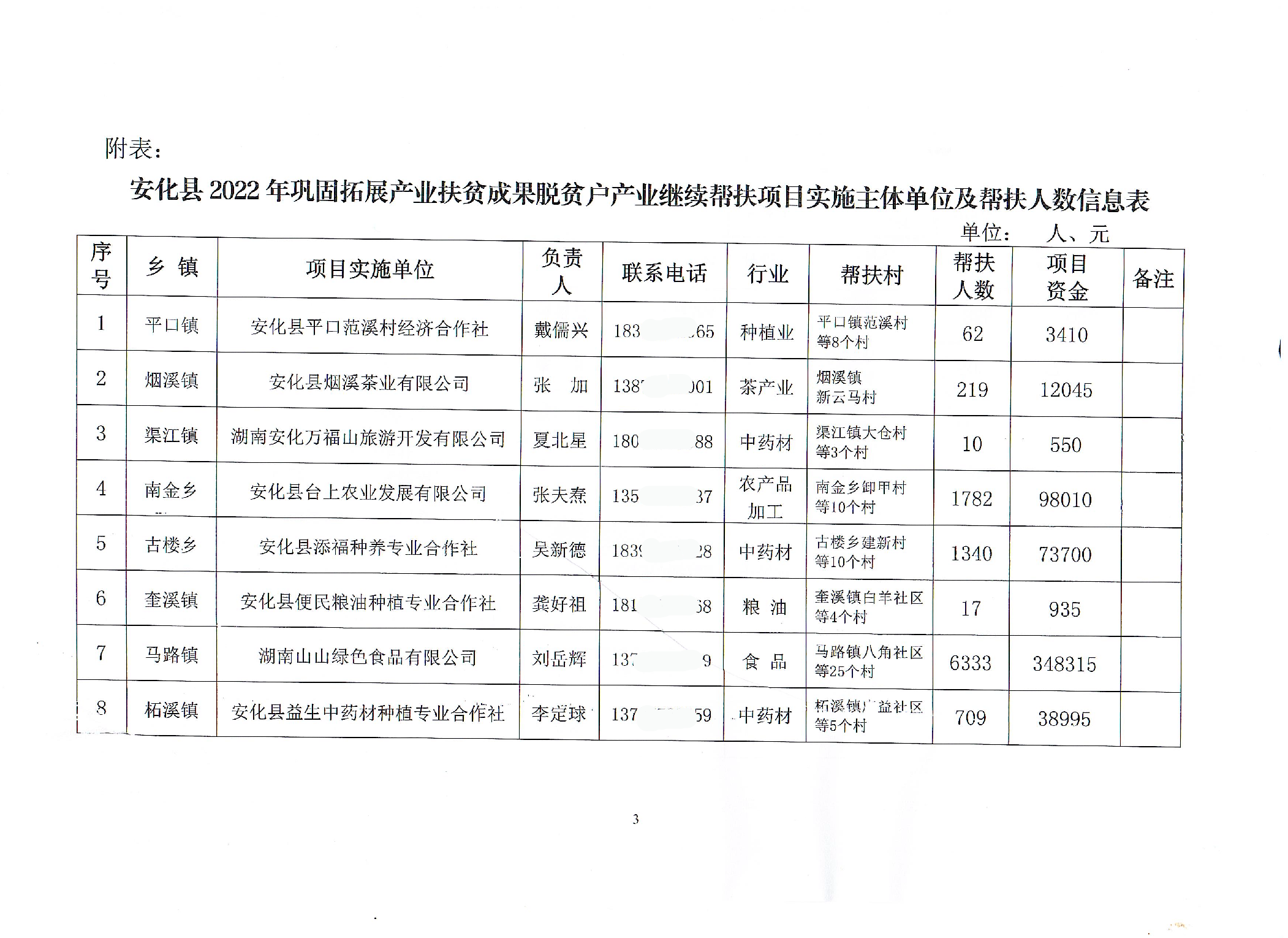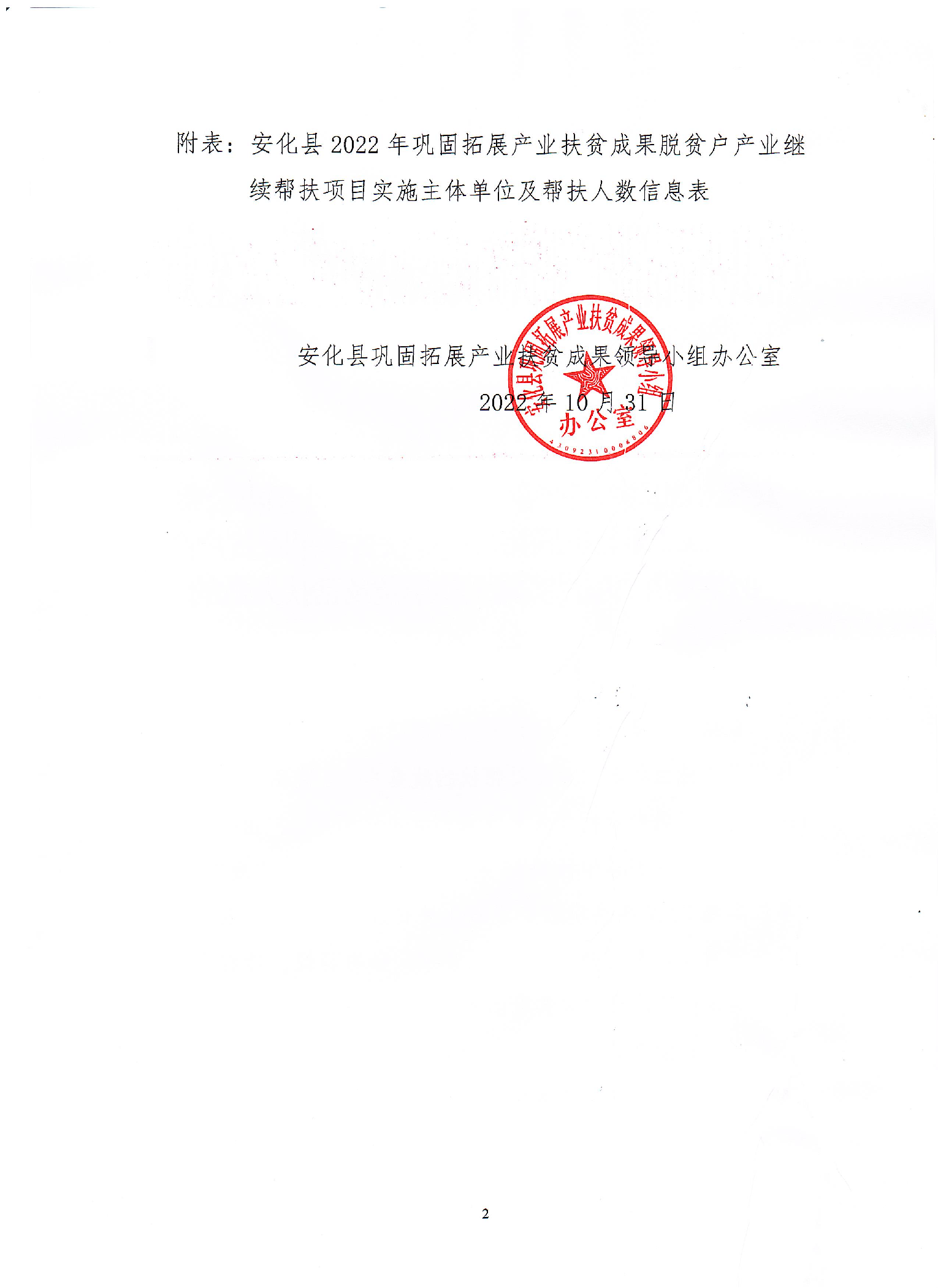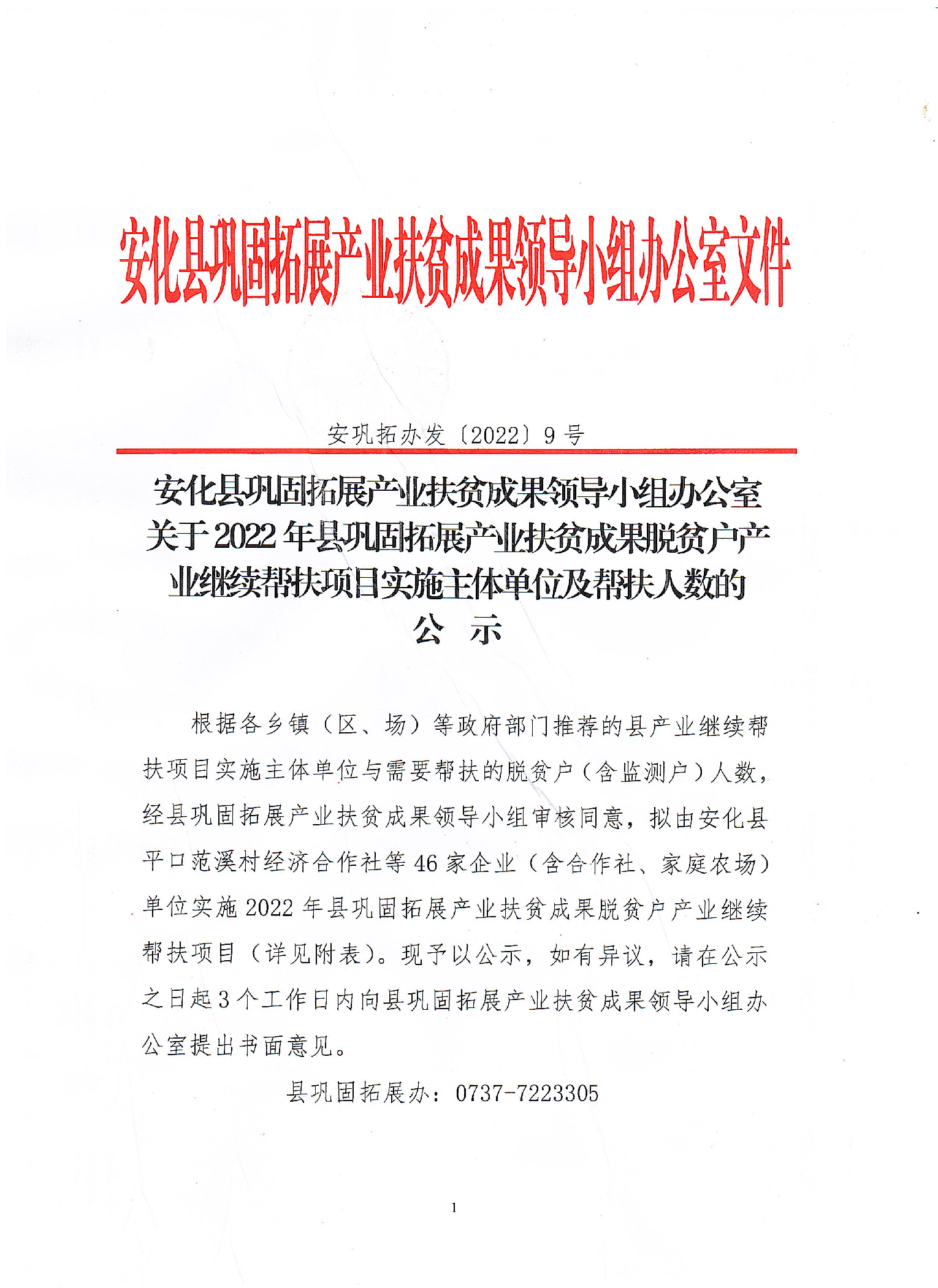 安化县巩固拓展产业扶贫成果领导小组办公室关于2022年县巩固拓展产业扶贫成果脱贫户产业继续帮扶项目实施主体单位及帮扶人数的公示 安巩固拓展办发[2022]9号