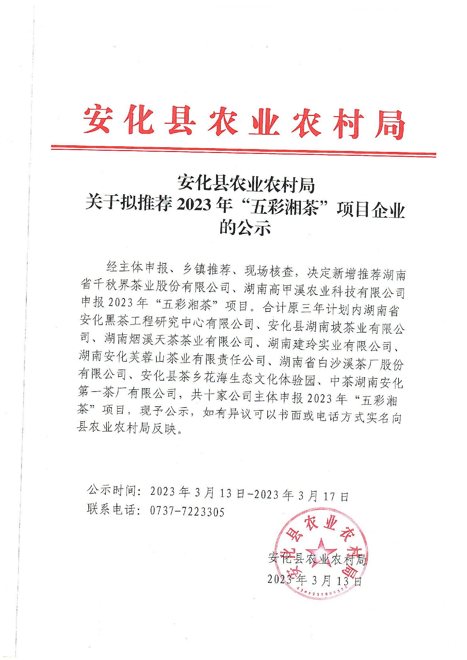 安化县农业农村局关于拟推荐2023年“五彩湘茶”项目企业的公示