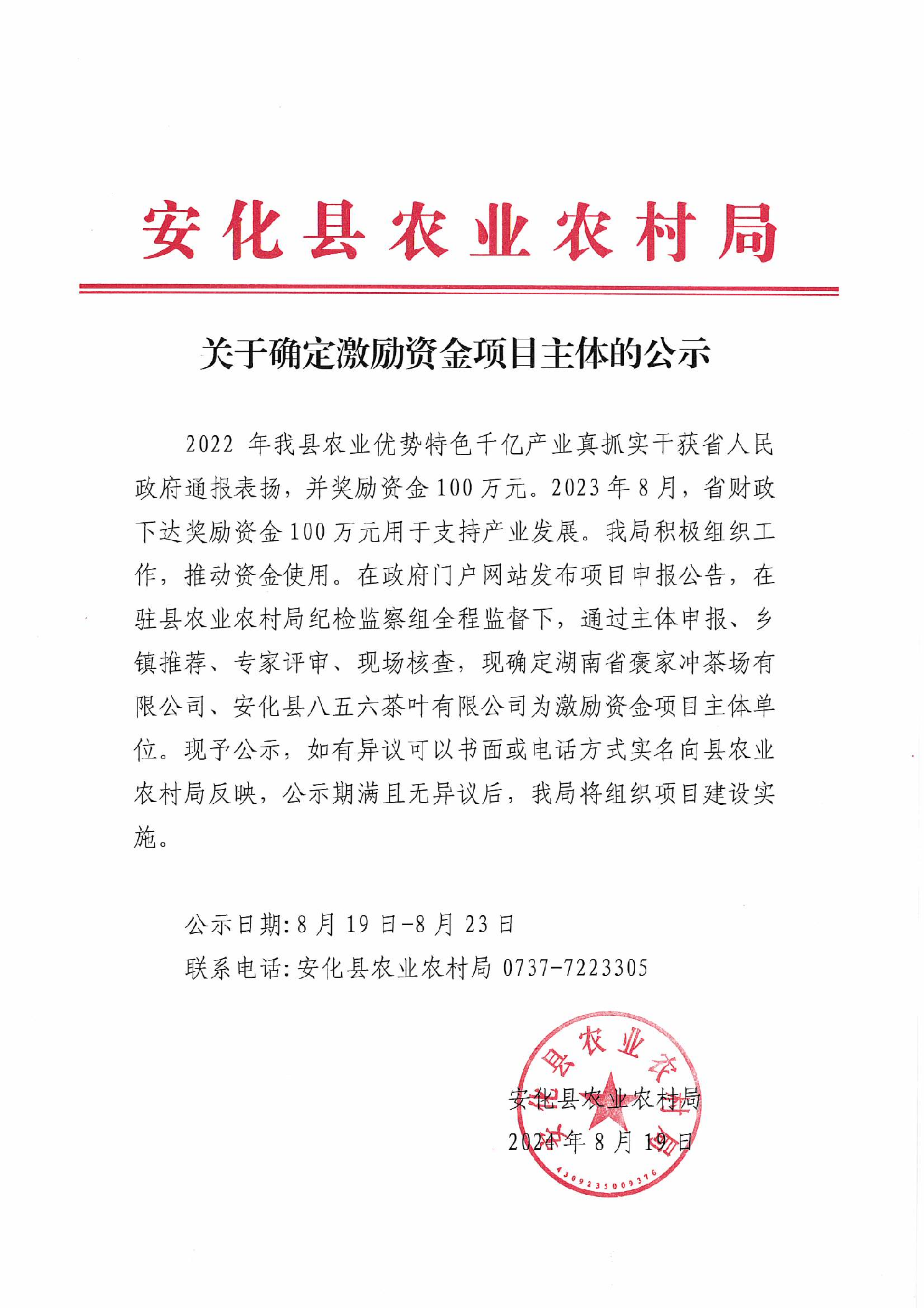 安化县农业农村局关于确定激励资金项目主体的公示