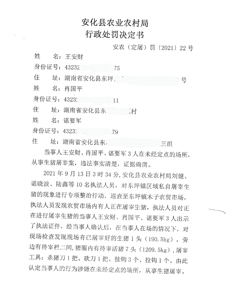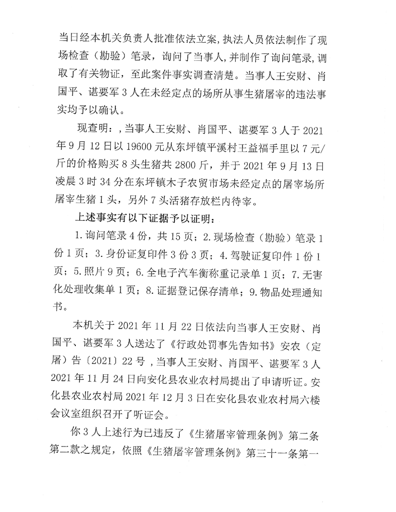 王安财、肖国平、谌要军生猪屠宰案行政处罚决定书 安农(定屠)罚【2021】22号