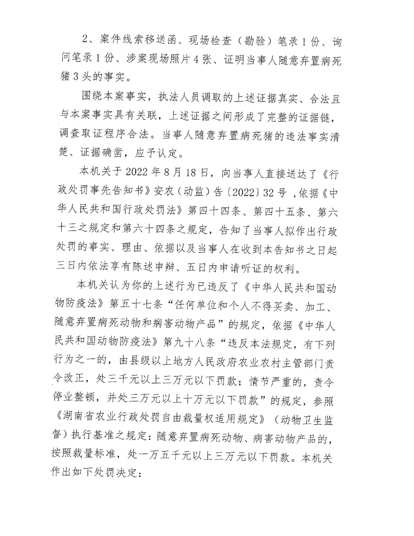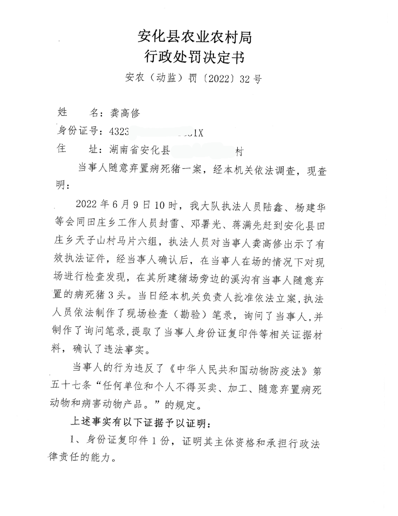 龚高修随意弃置病死猪案行政处罚决定书 安农(动监)罚〔2022〕32号