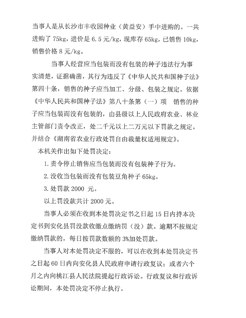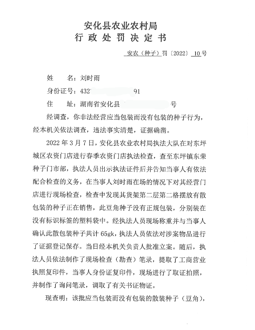 刘时雨非法经营种子案行政处罚决定书 安农(种子)罚【2022】10号