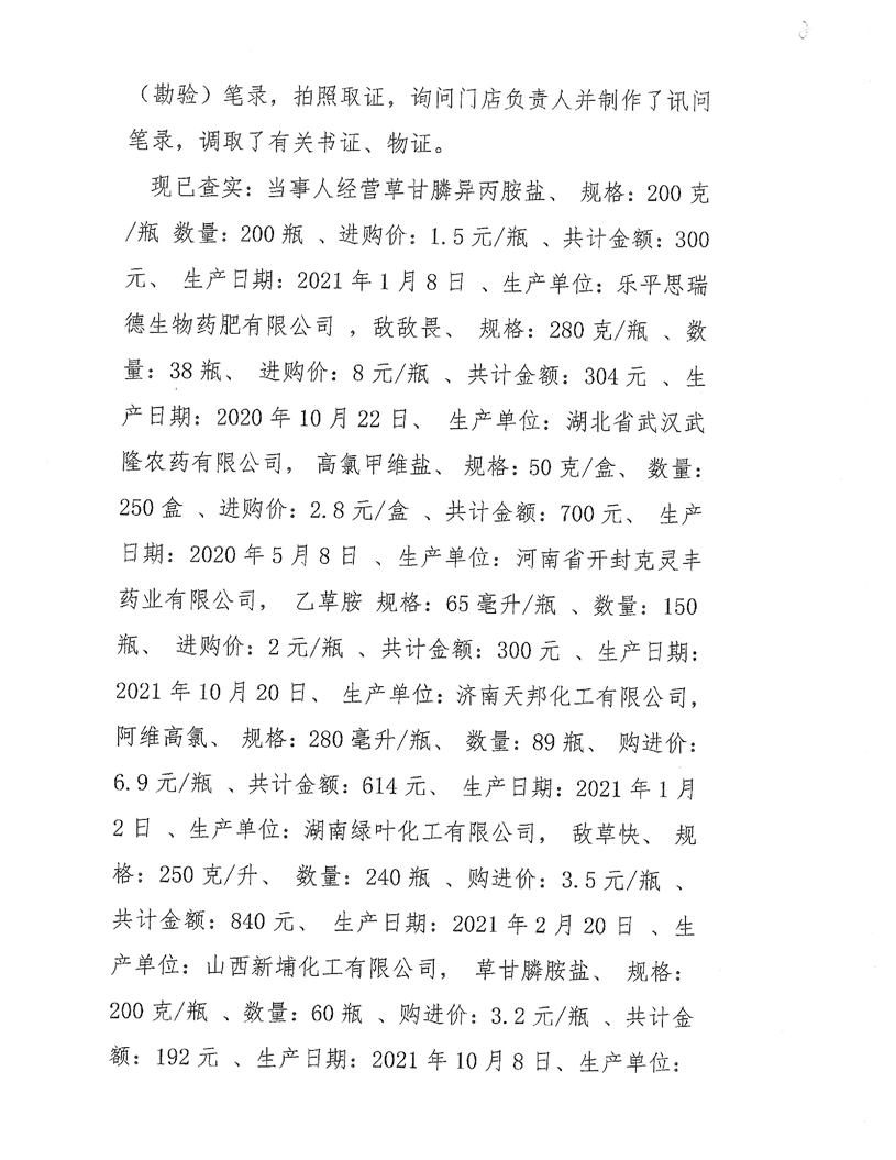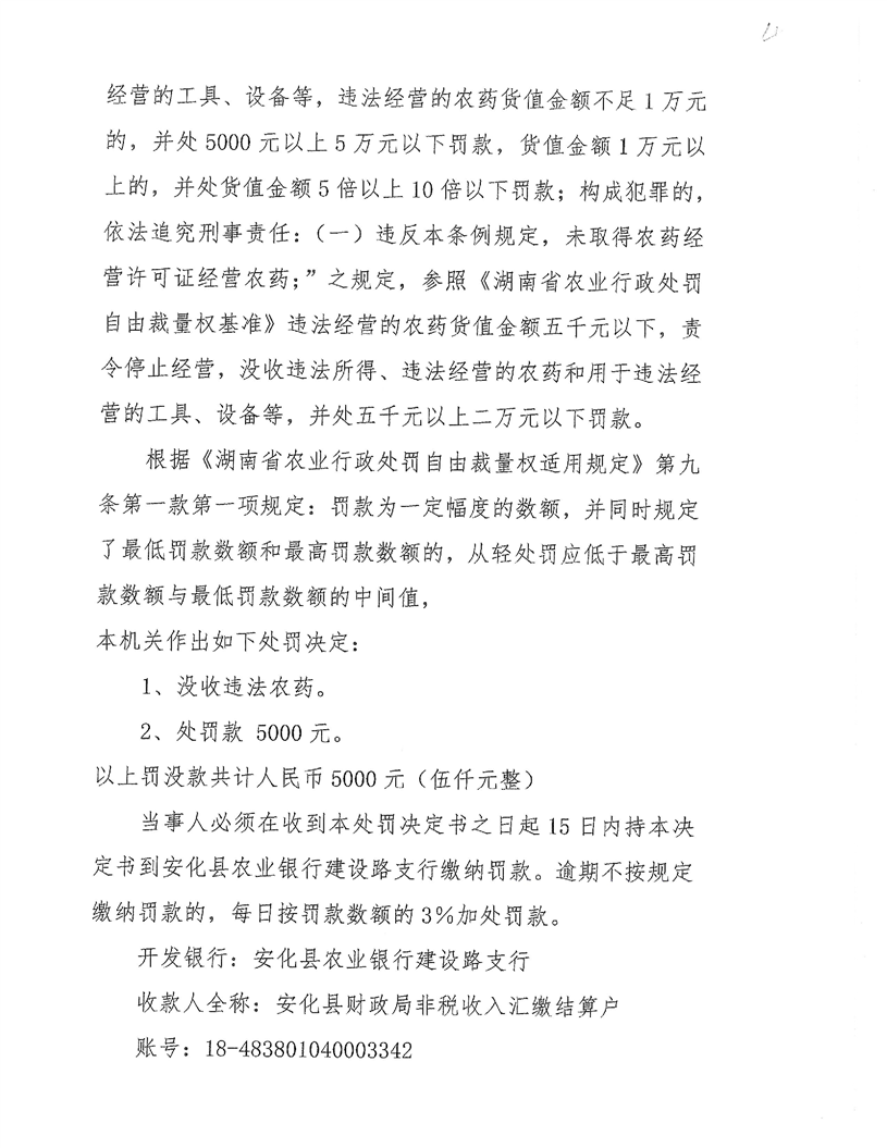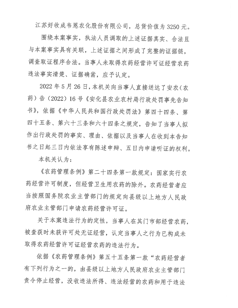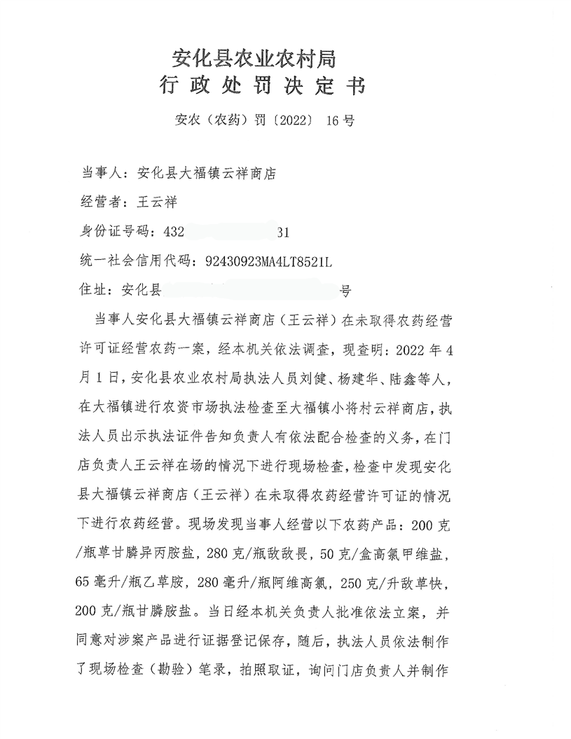 王云祥无证经营农药案行政处罚决定书 安农(农药)罚【2022】16号