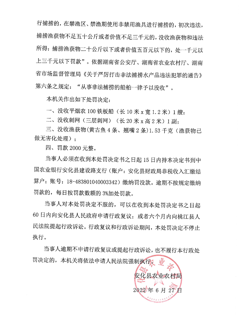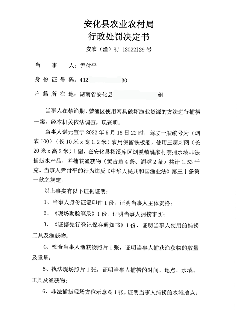 尹付平禁渔期捕捞案行政处罚决定书 安农(渔)罚【2022】29号