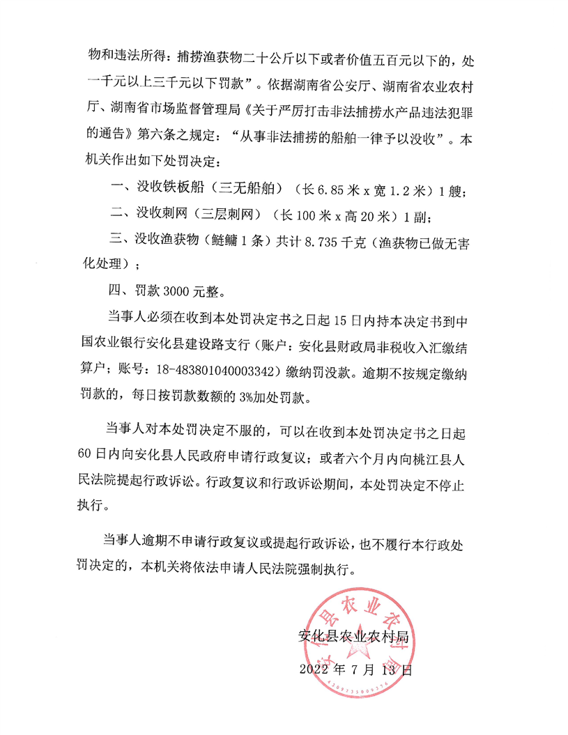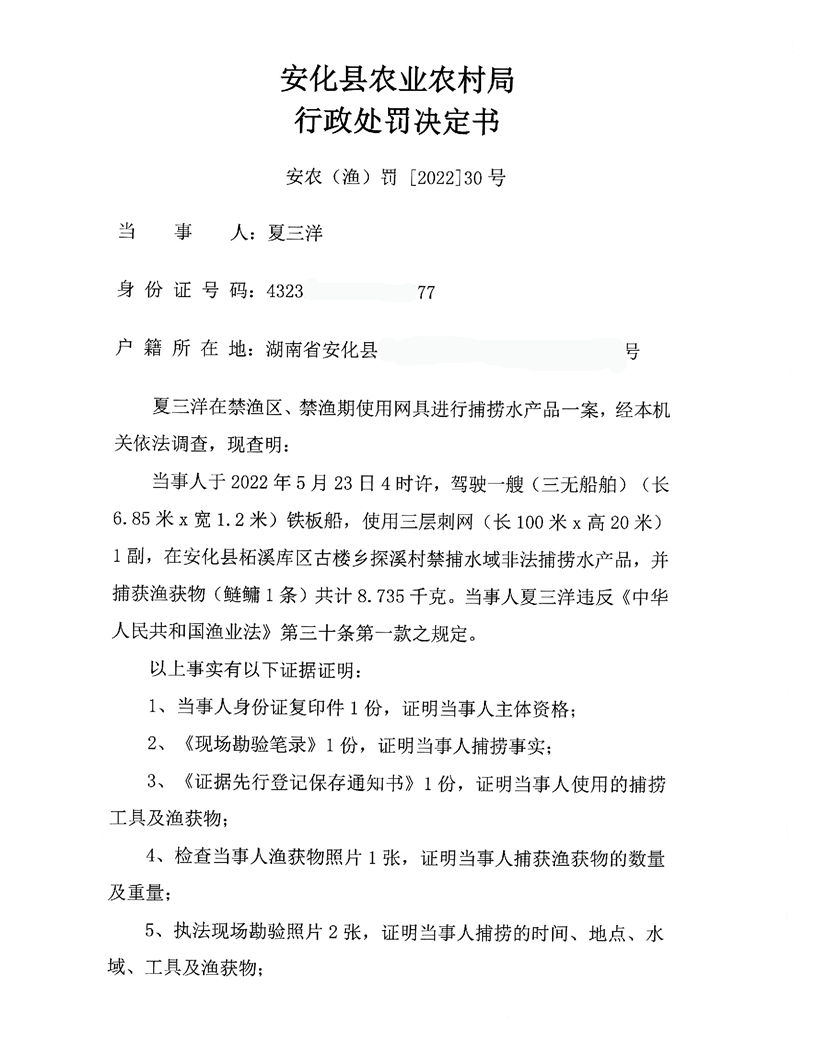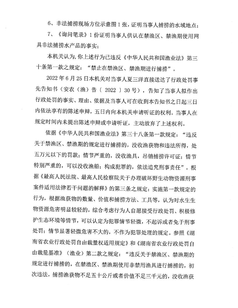 夏三洋禁渔期捕捞案行政处罚决定书 安农(渔)罚【2022】30号