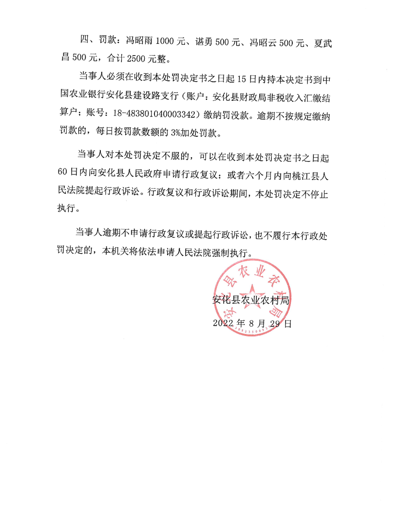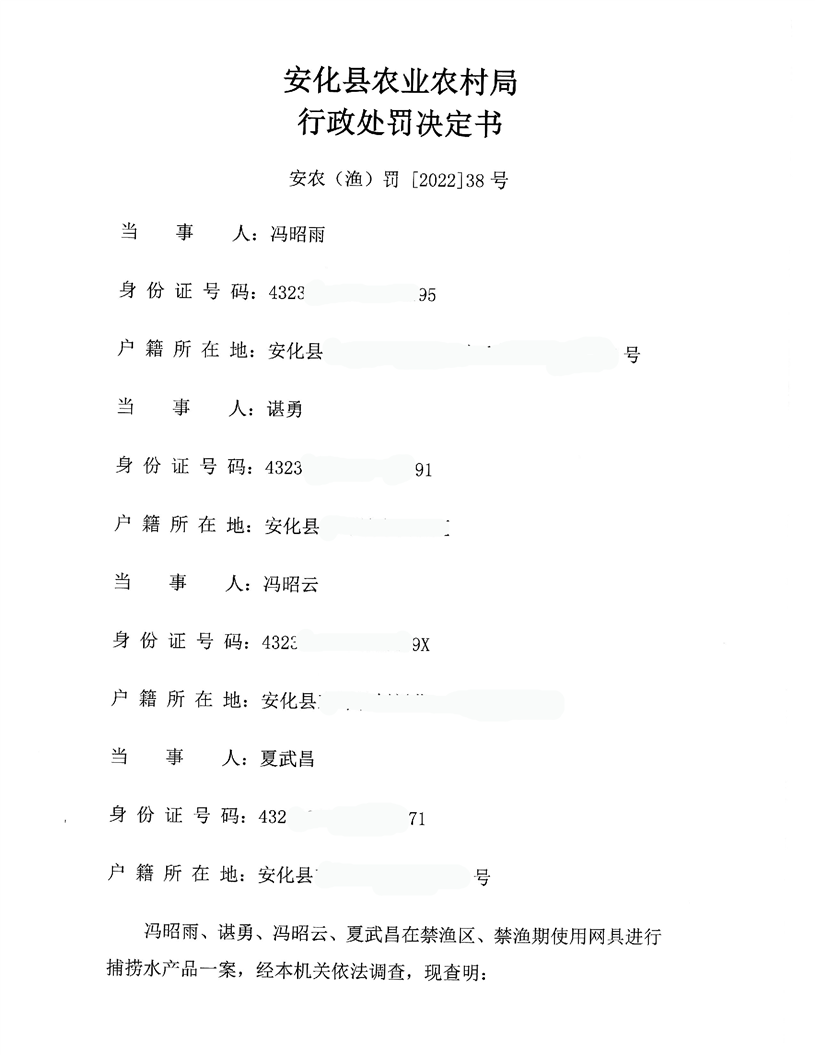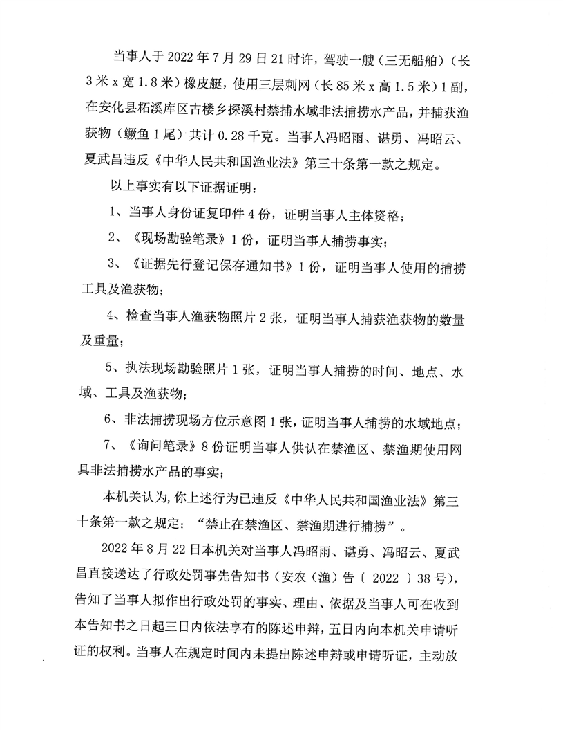 冯昭雨、谌勇、冯昭云、夏武昌在禁渔期捕捞案行政处罚决定书 安农(渔)罚【2022】38号