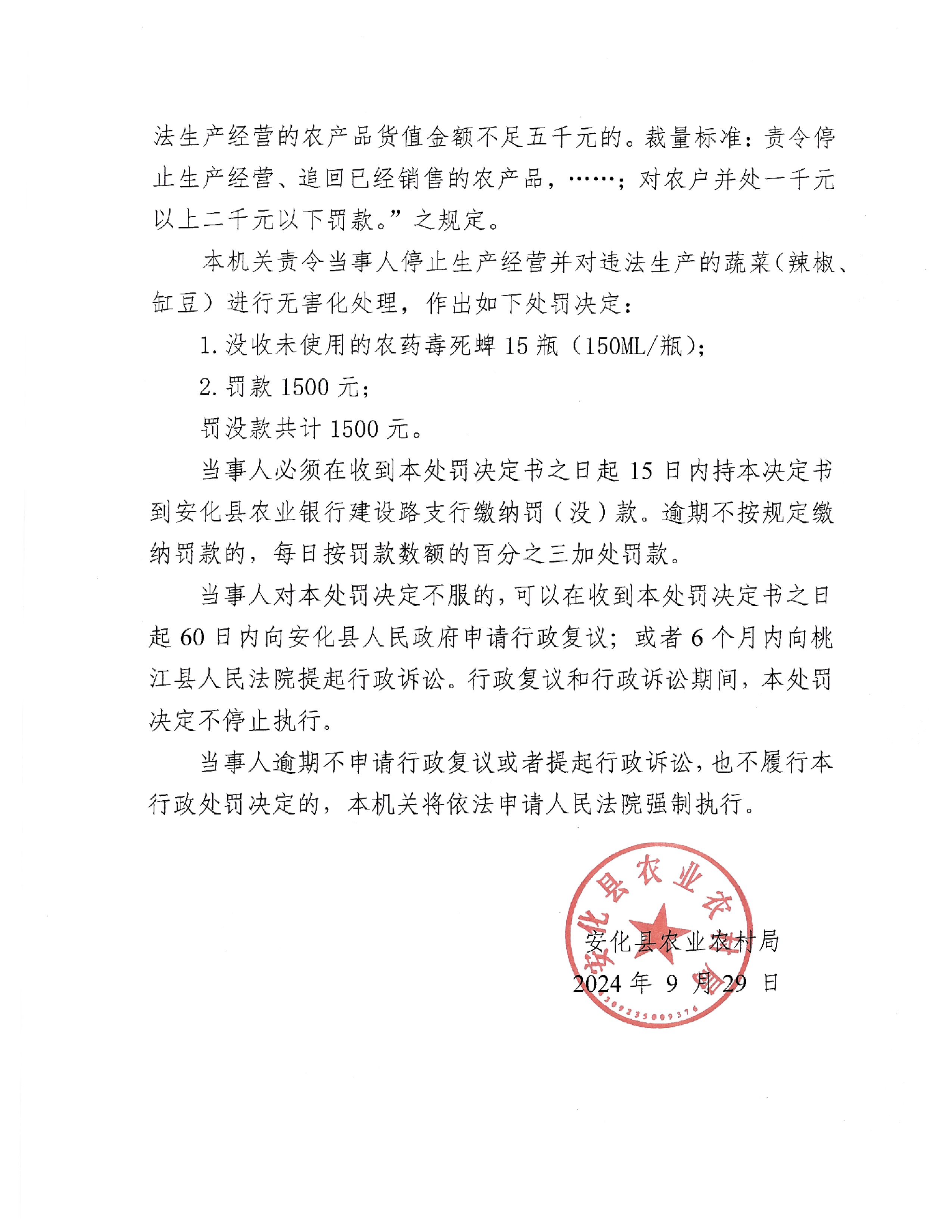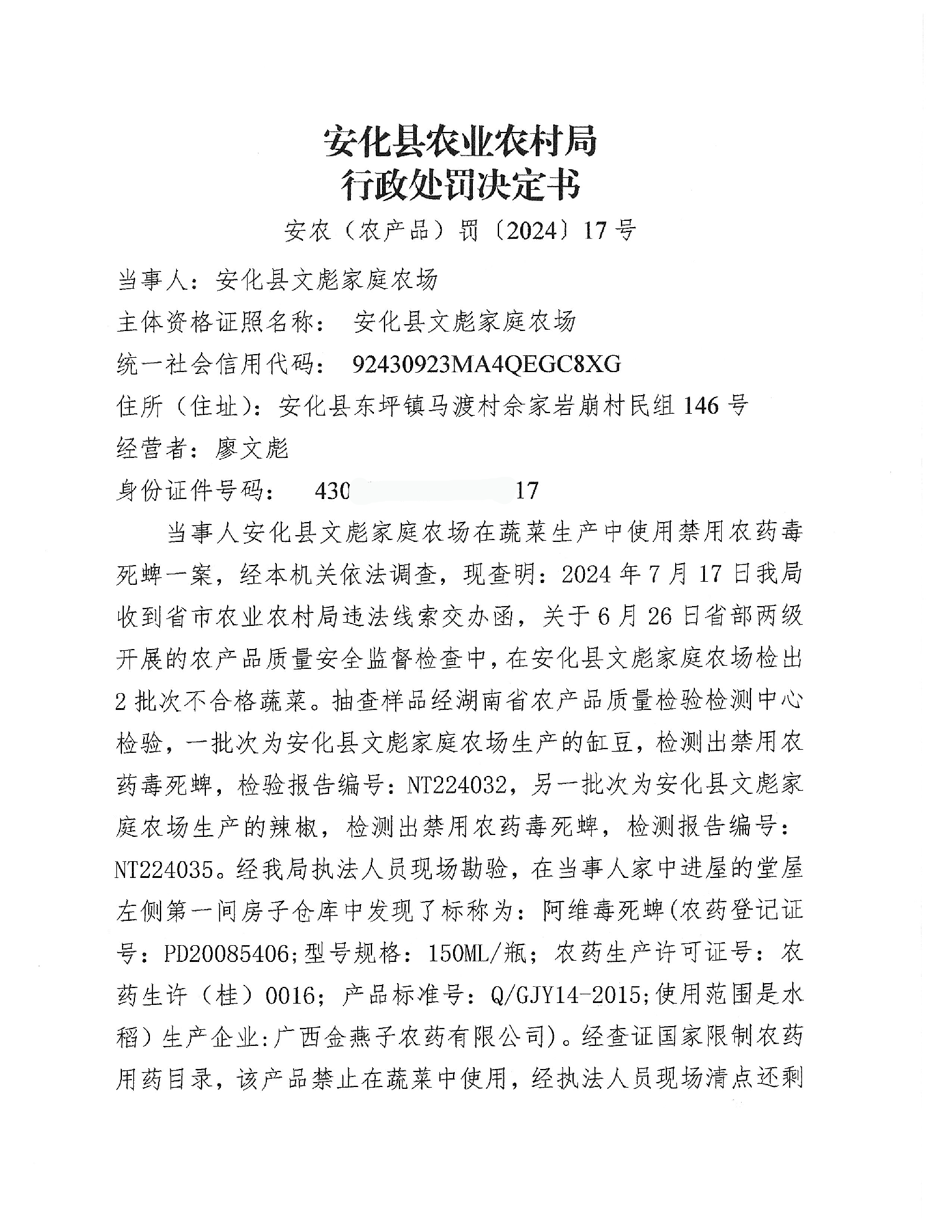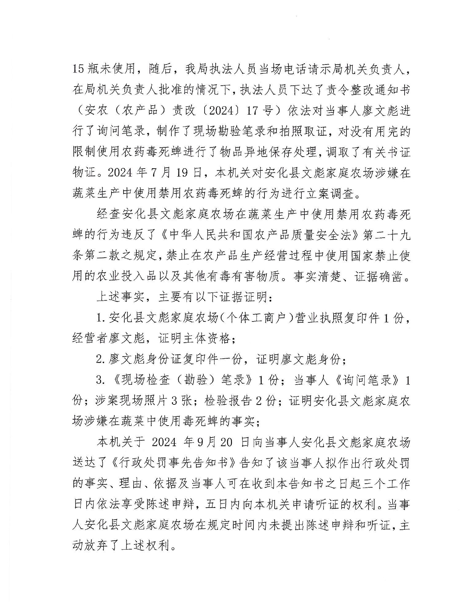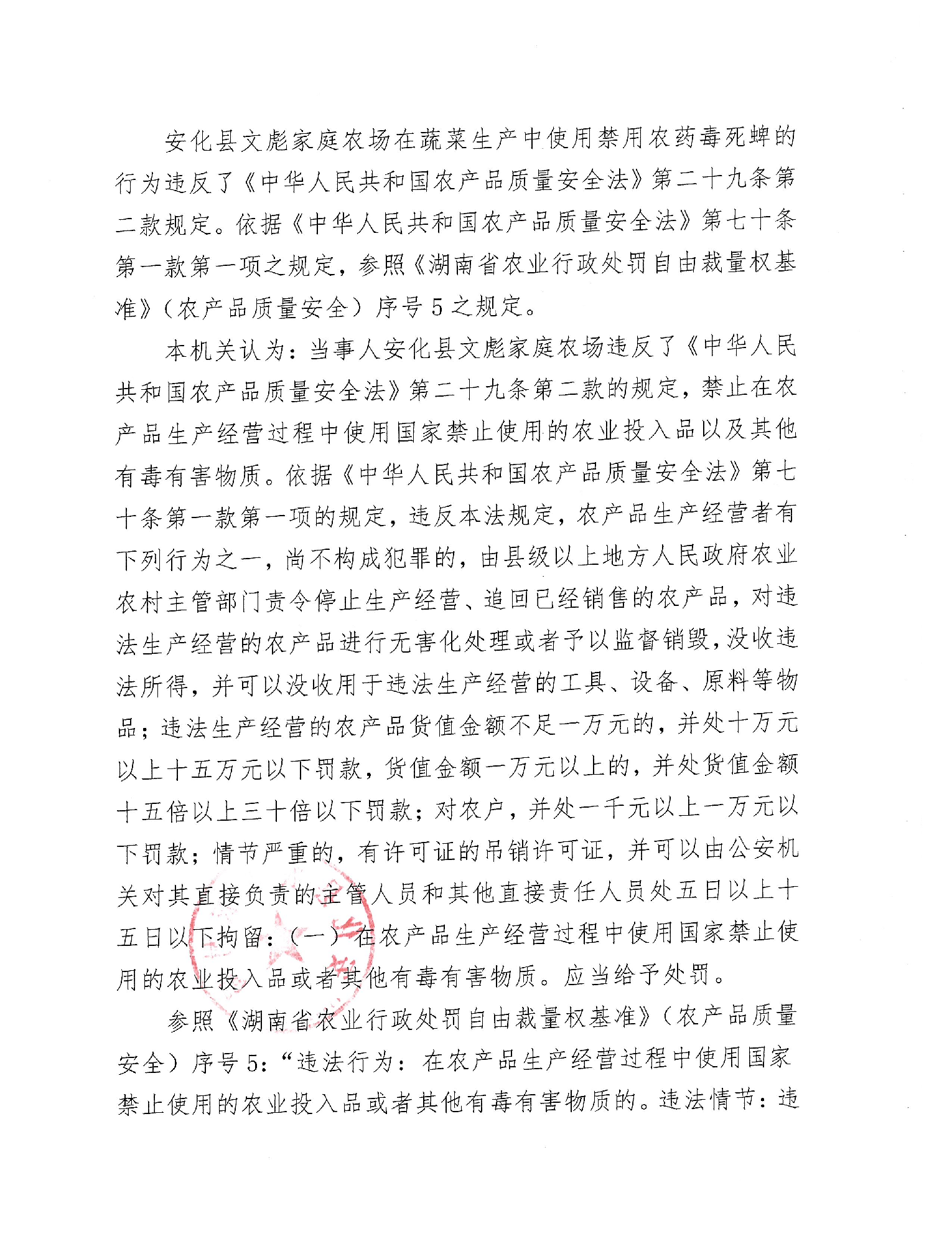 安化县文彪家庭农场在蔬菜生产中使用禁用农药毒死蜱一案行政处罚决定书 安农(农产品)罚〔2024〕17号