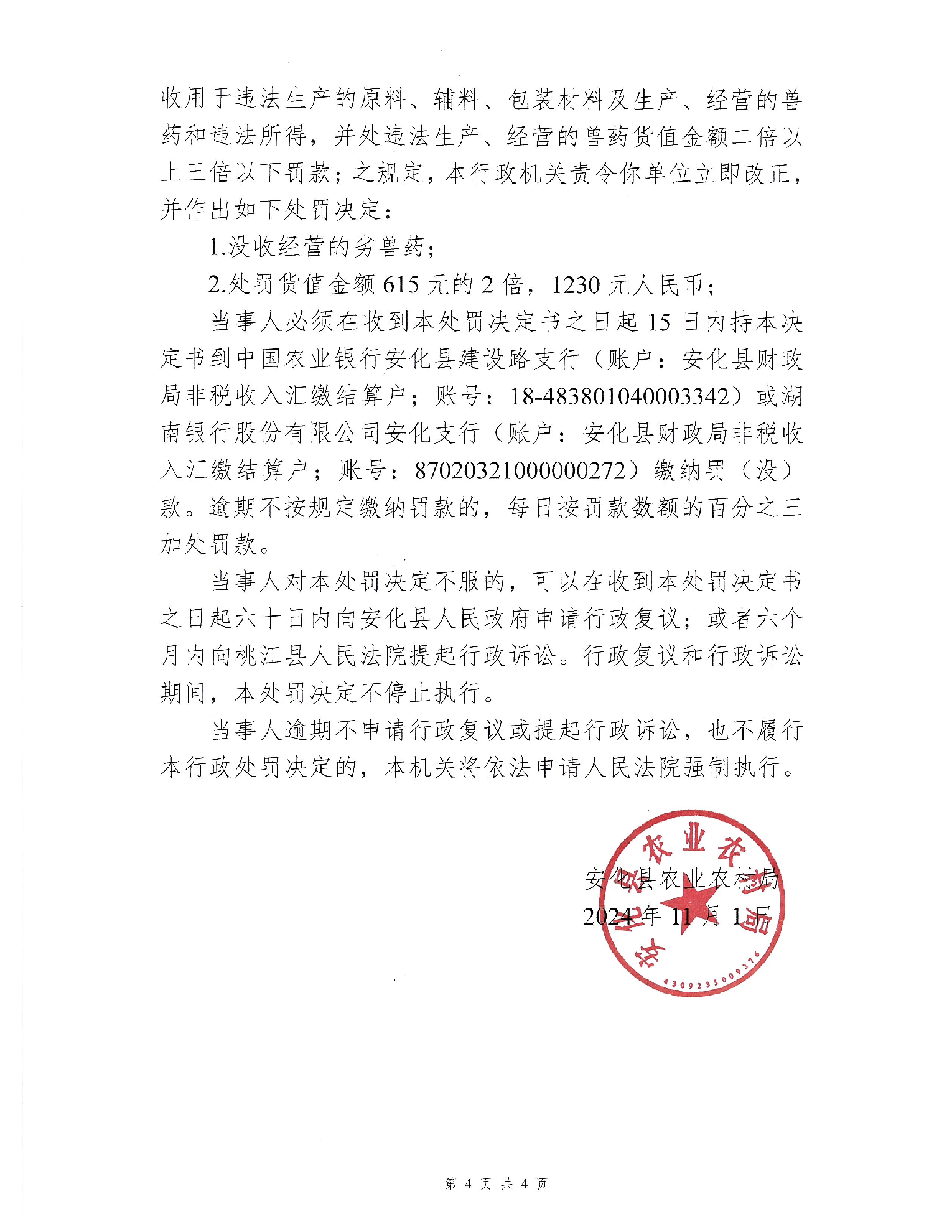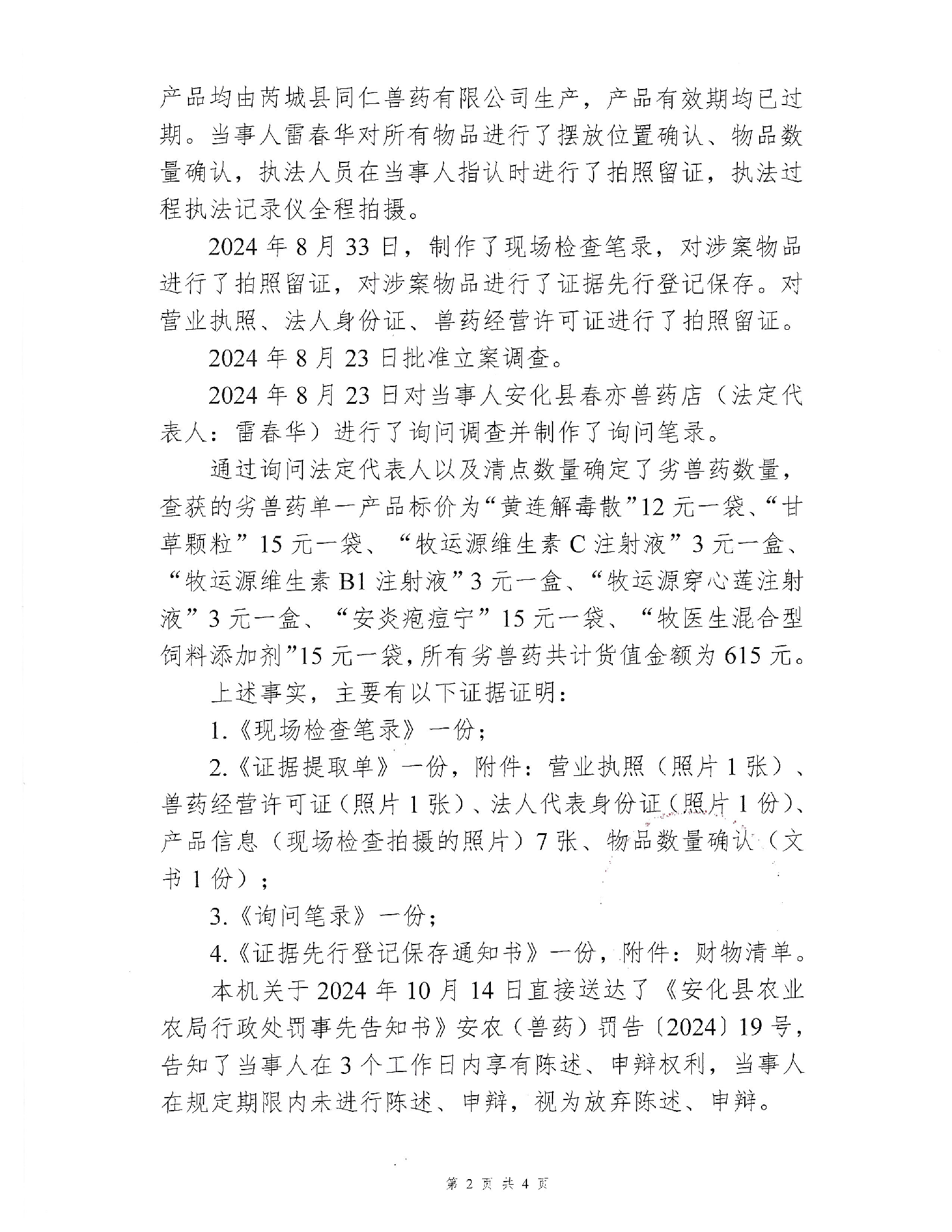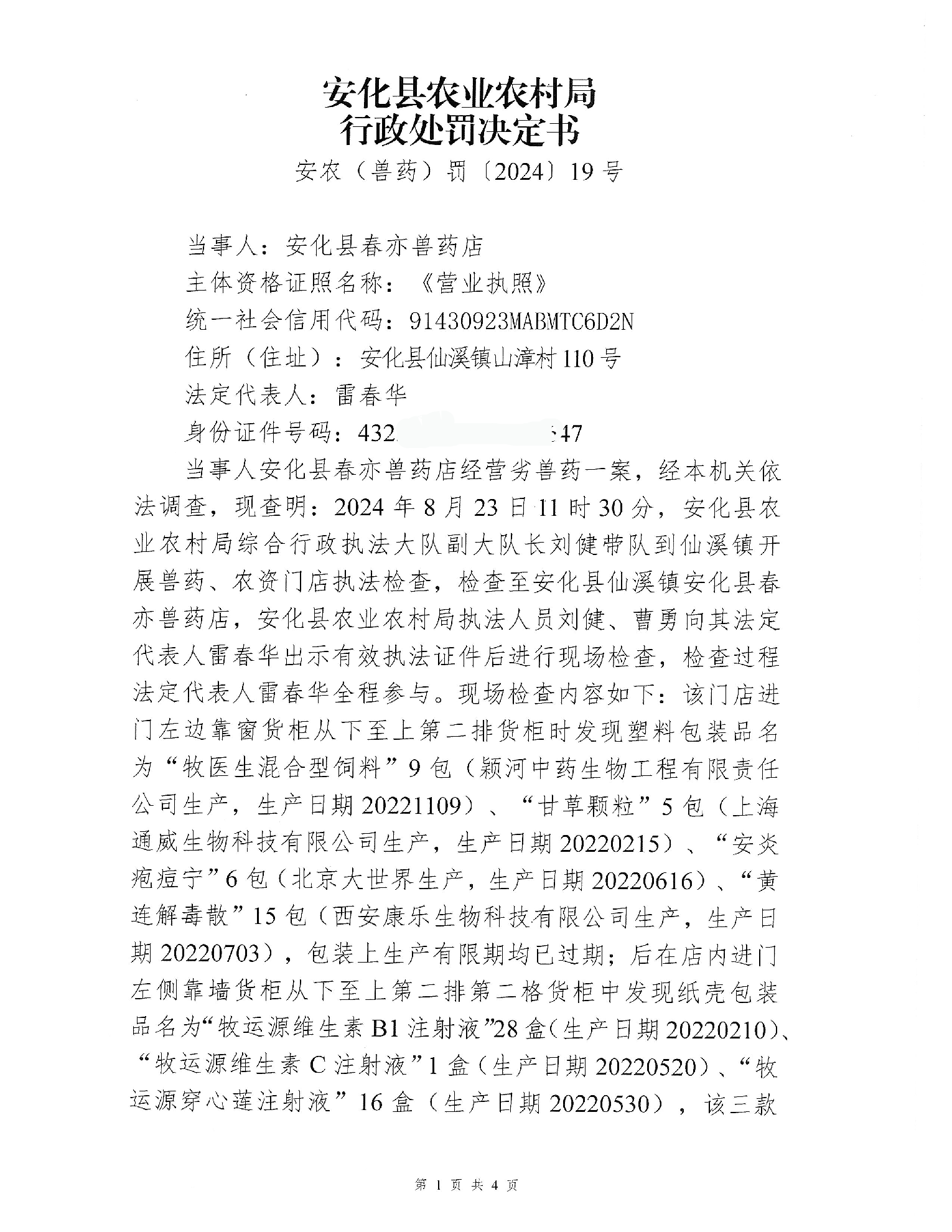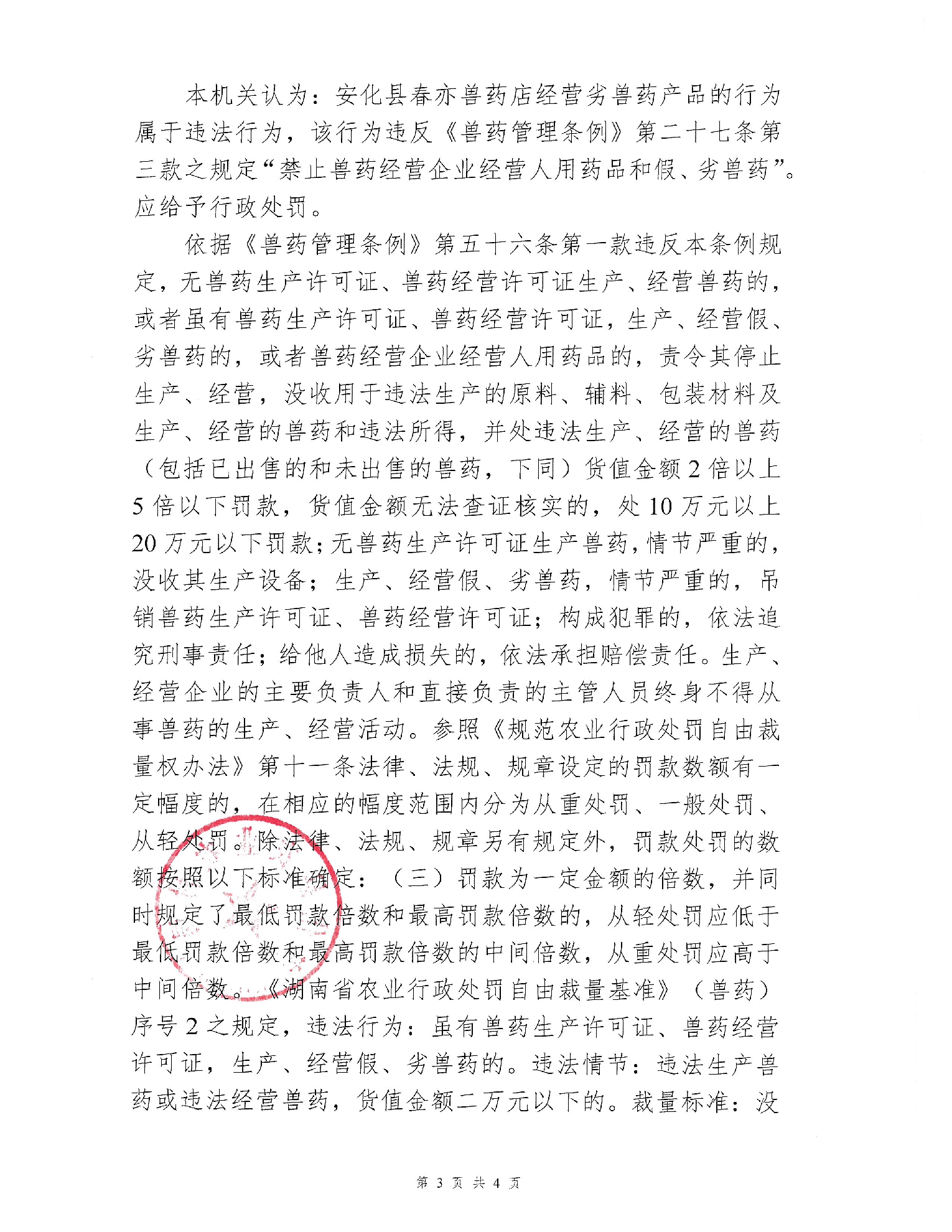 安化县春亦兽药店经营劣兽药一案的行政处罚决定书 安农(兽药)罚〔2024〕19号