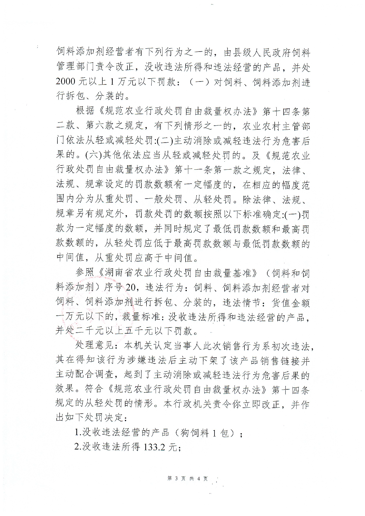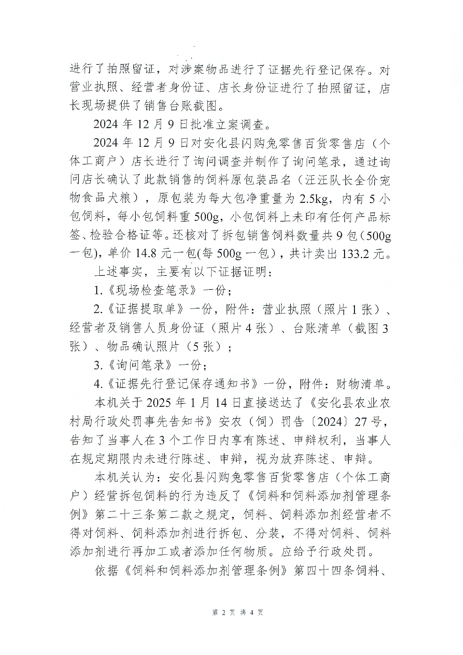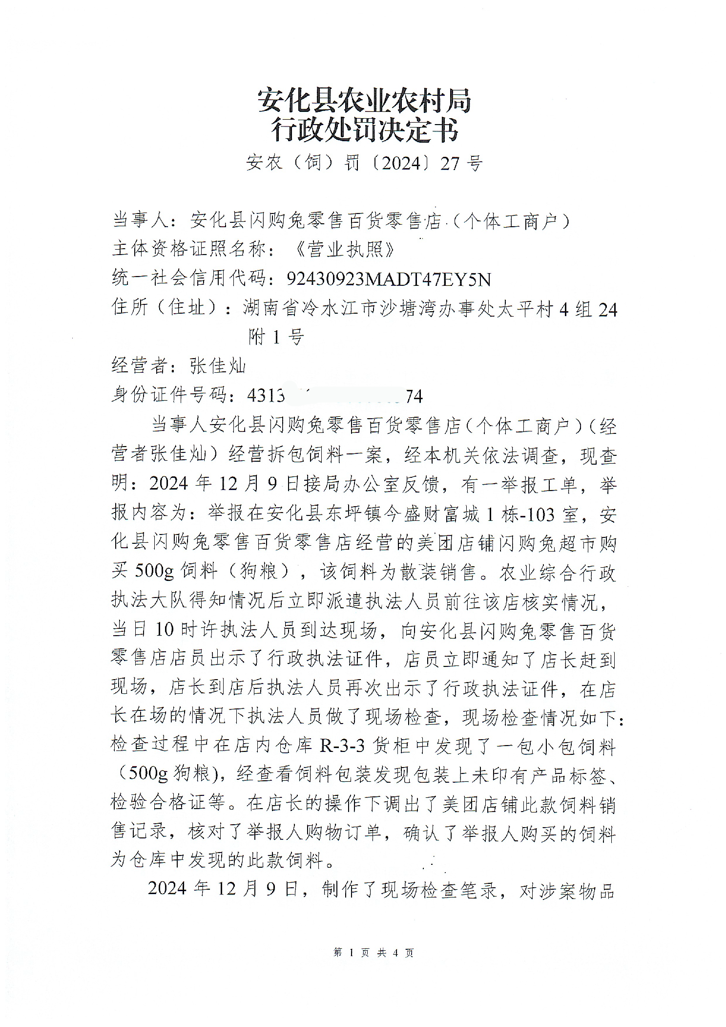 安化县闪购兔零售百货零售店(经营者张佳灿)经营拆包饲料一案的行政处罚决定书 安农(饲)罚〔2024〕27号