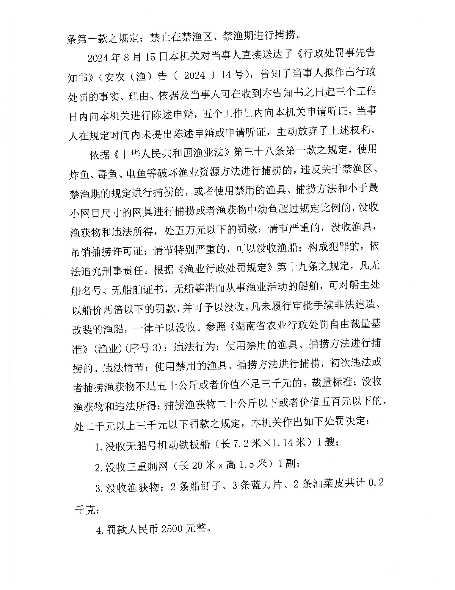 魏解军在禁渔区、禁渔期使用禁用的渔具捕捞水产品一案行政处罚决定书 安农(渔)罚〔2024〕14号