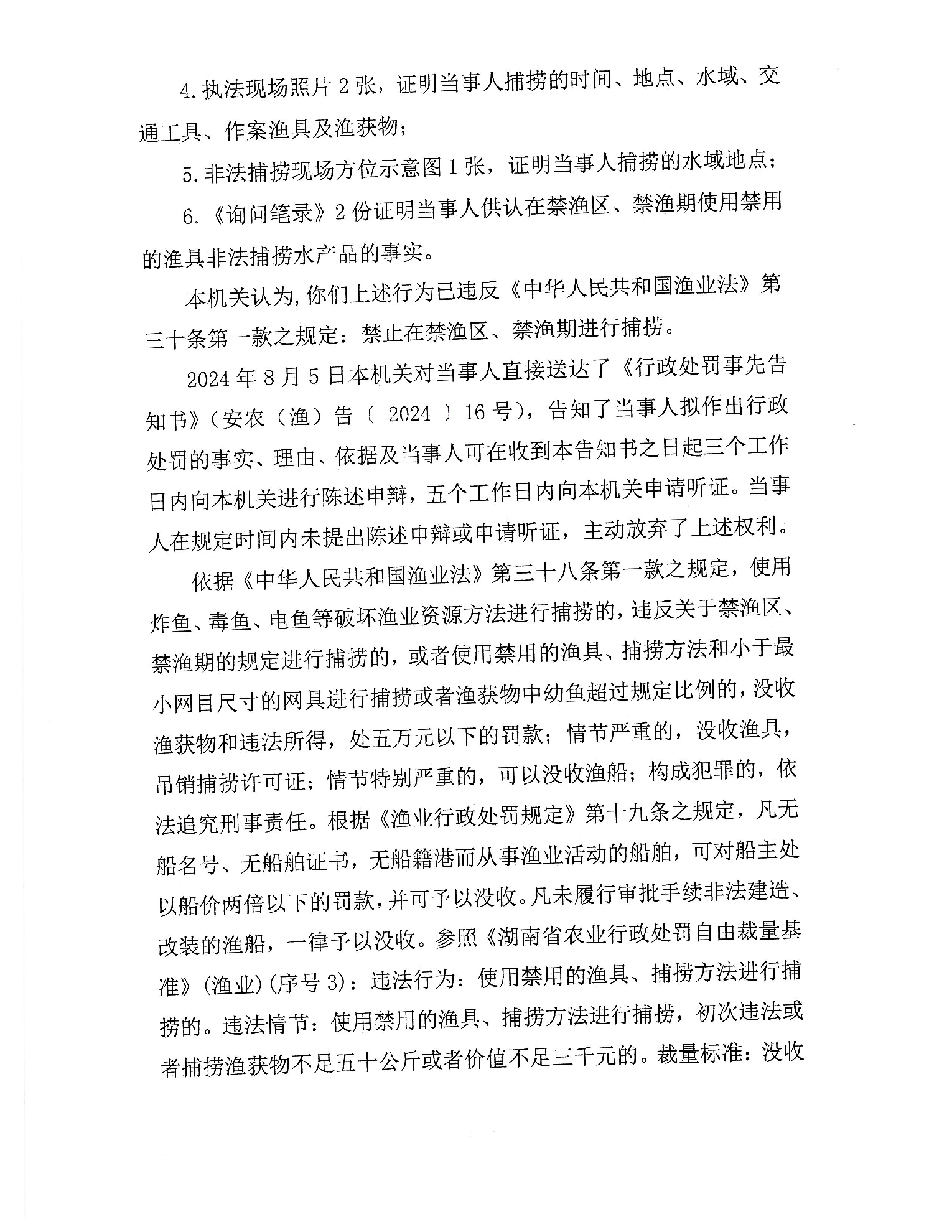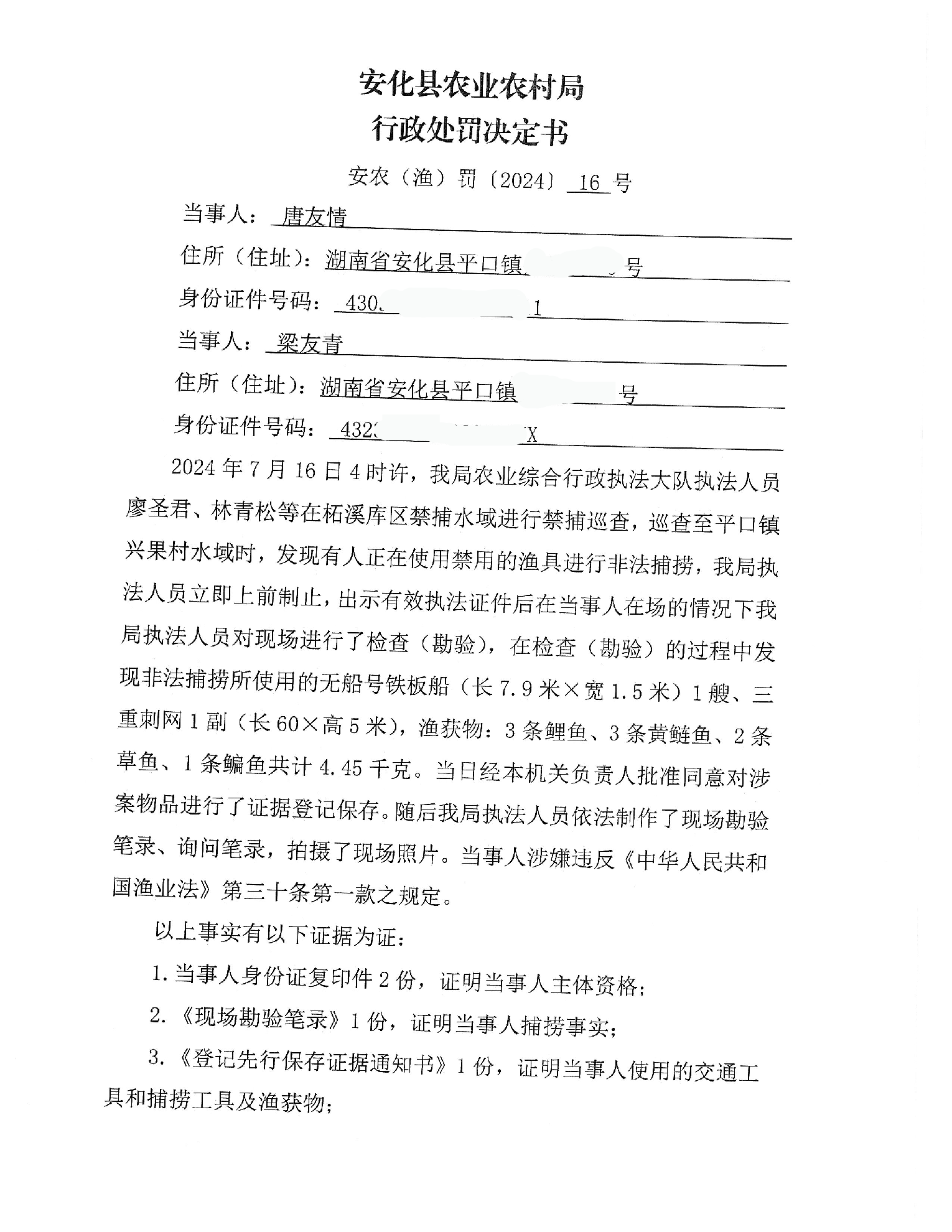 唐友情、梁友青在禁渔区、禁渔期使用禁用的渔具捕捞水产品一案行政处罚决定书 安农(渔)罚〔2024〕16号