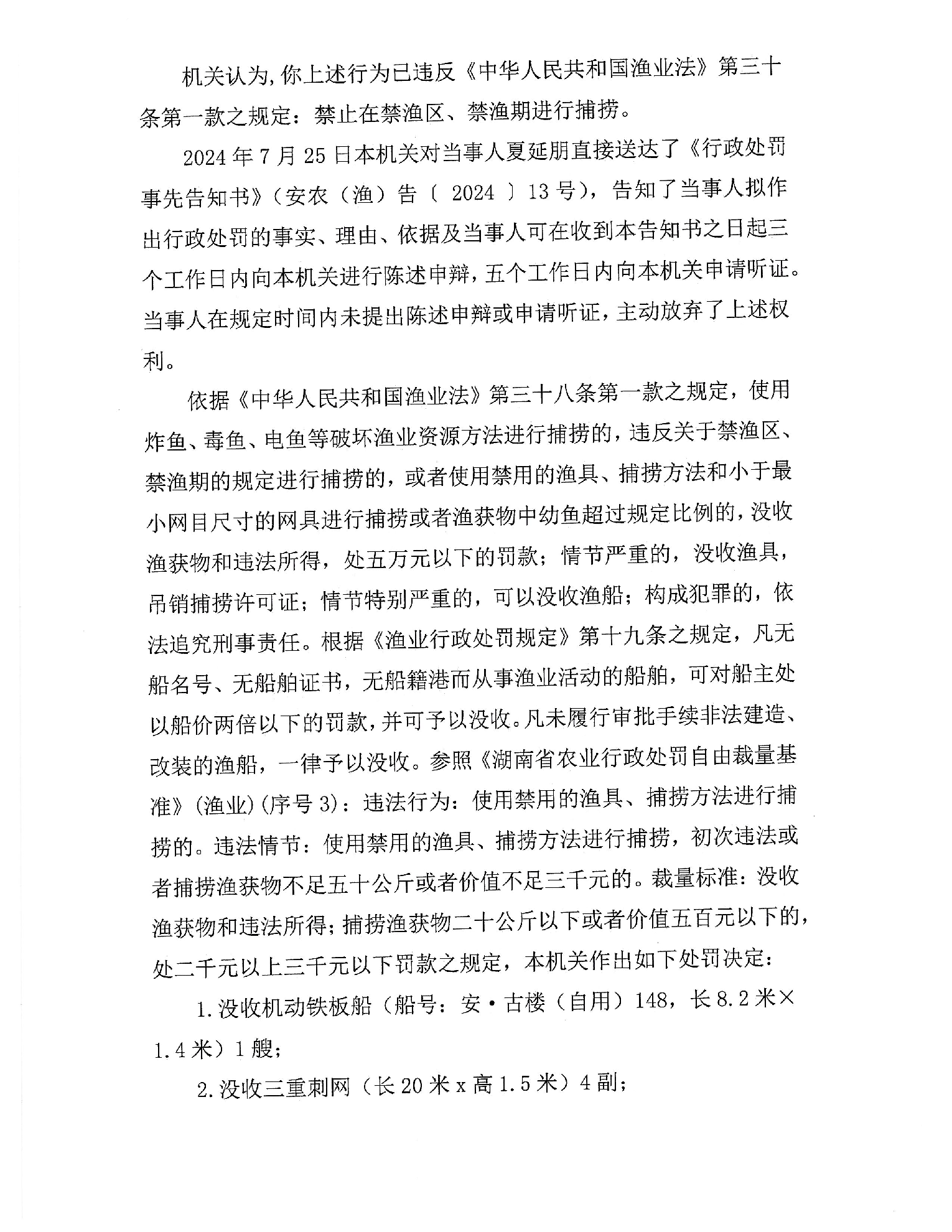 夏延朋在禁渔区、禁渔期使用禁用的渔具捕捞水产品一案行政处罚决定书 安农(渔)罚〔2024〕13号