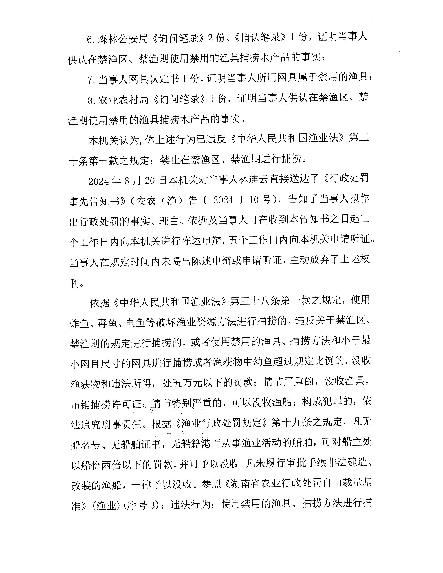 林连云在禁渔区、禁渔期使用禁用的渔具捕捞水产品一案行政处罚决定书 安农(渔)罚〔2024〕10号