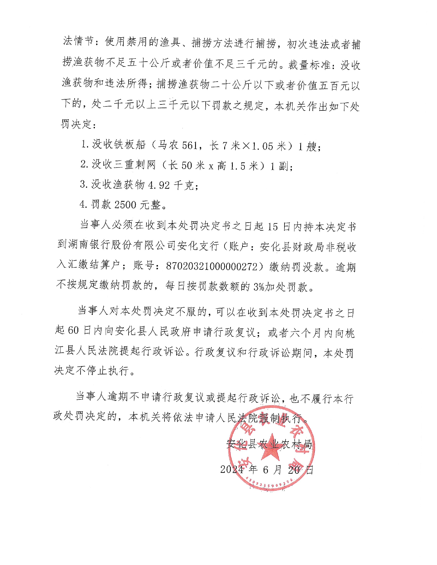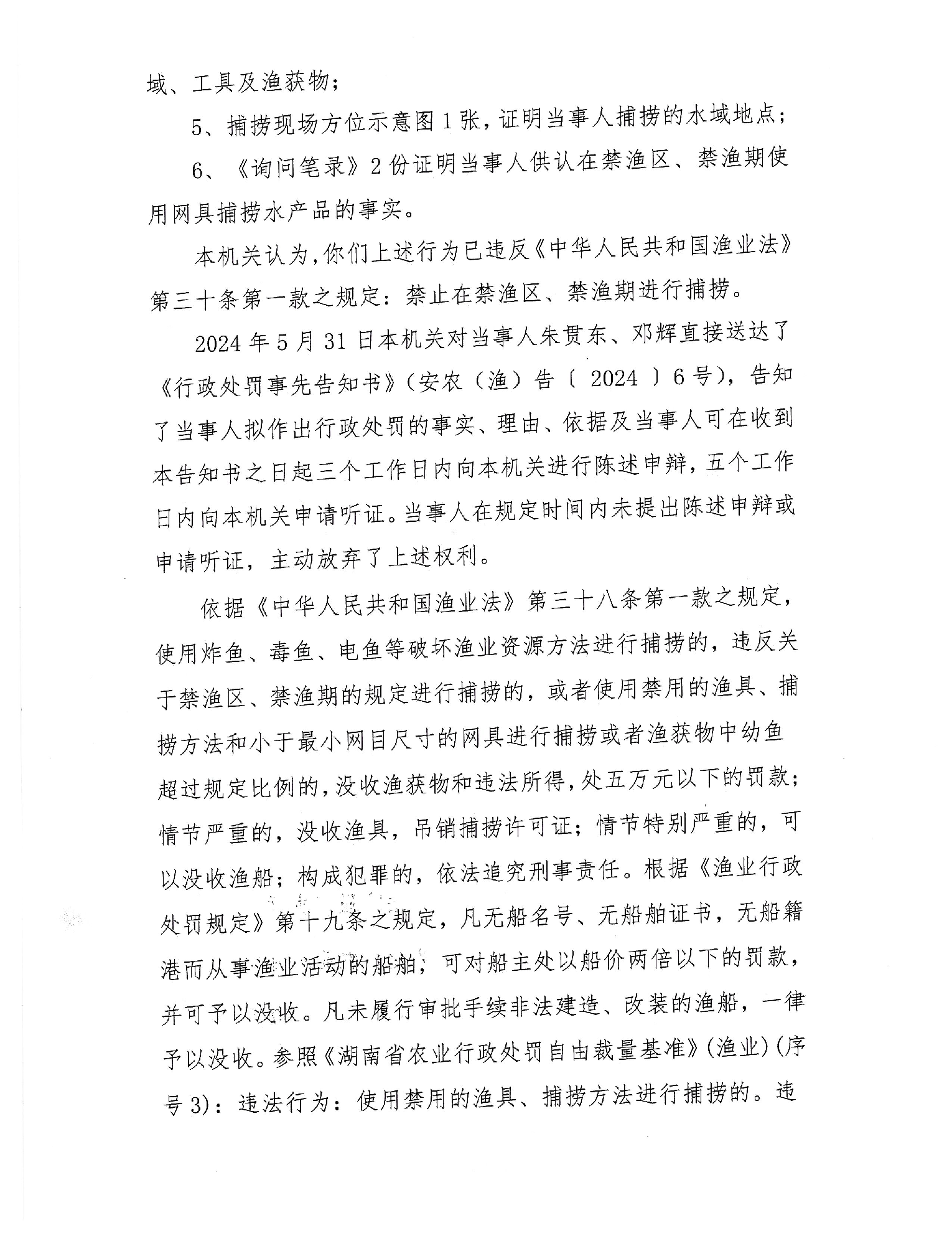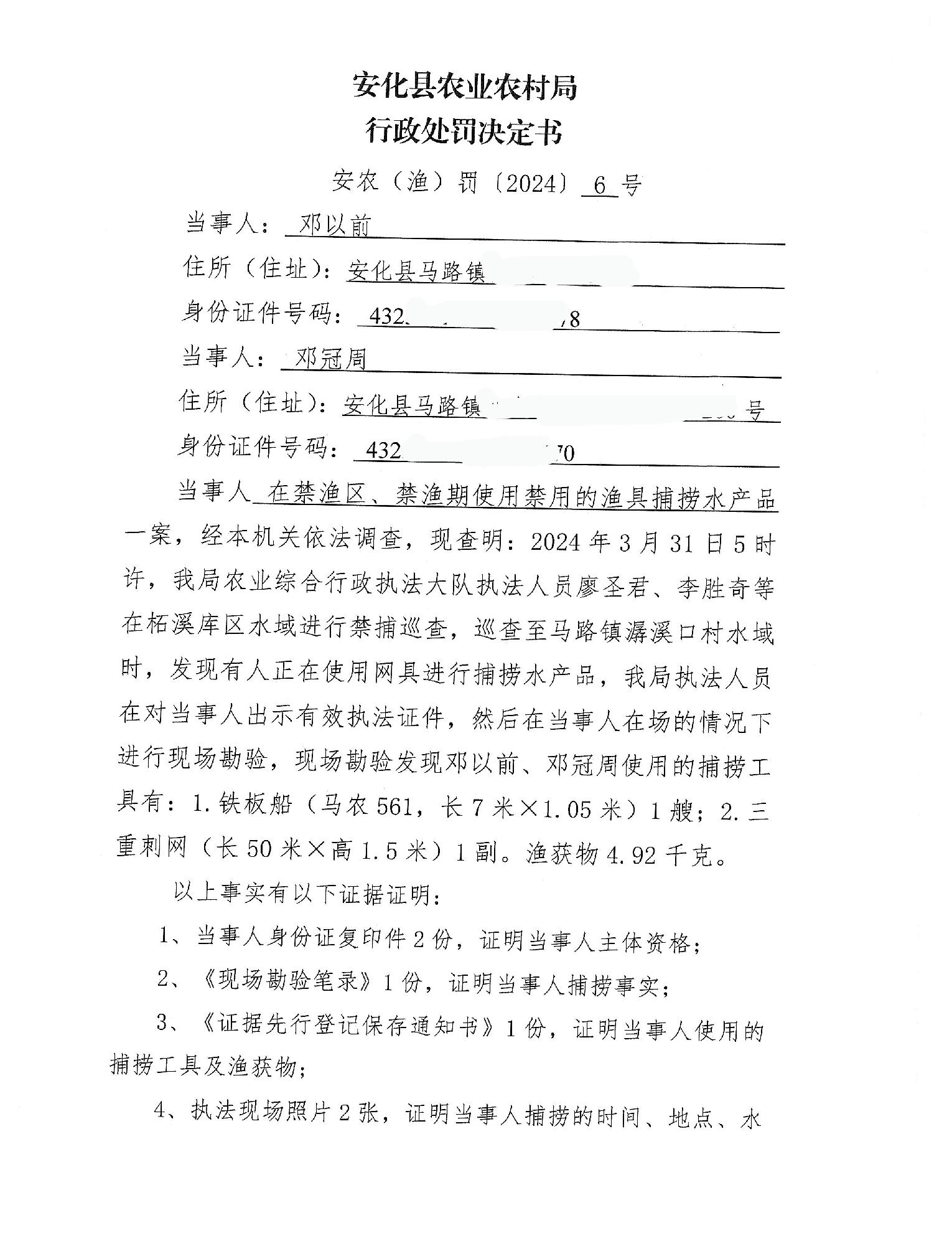 邓以前、邓冠周在禁渔区、禁渔期使用禁用的渔具捕捞水产品一案行政处罚决定书 安农(渔)罚〔2024〕6号