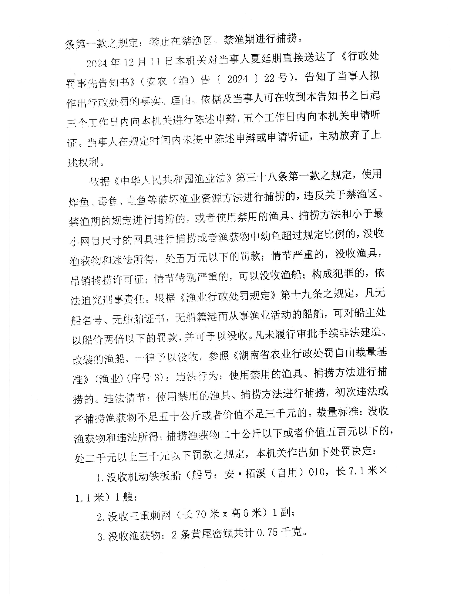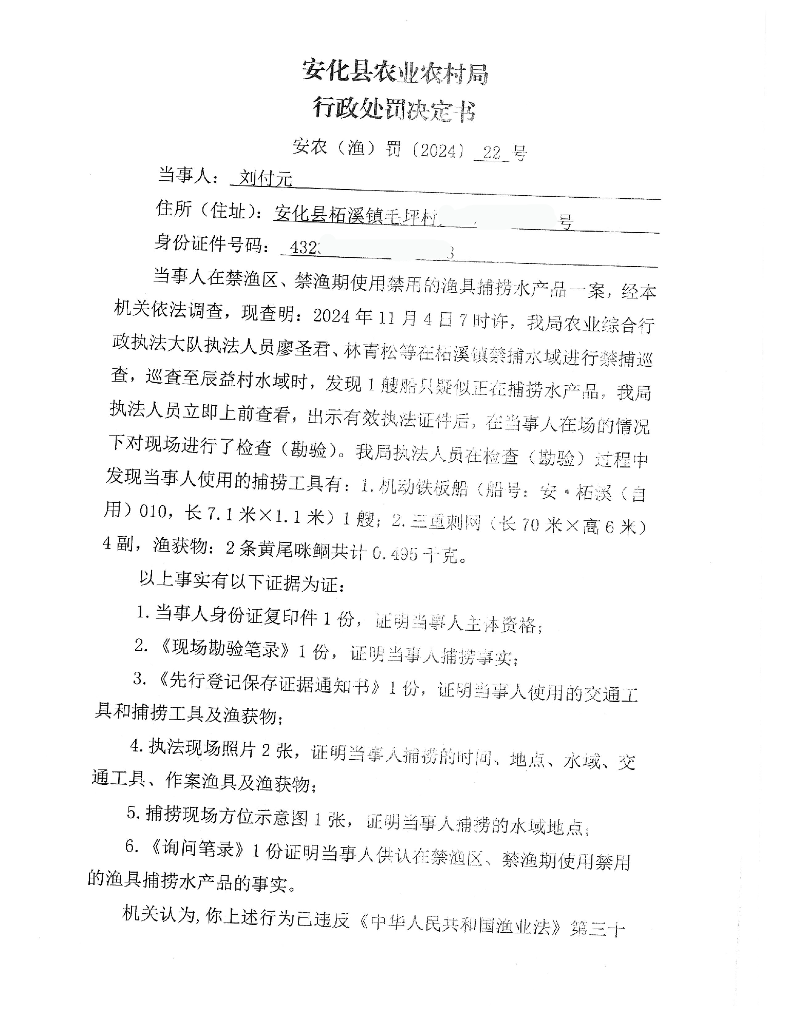 刘付元在禁渔区、禁渔期使用禁用的渔具捕捞水产品一案行政处罚决定书 安农(渔)罚〔2024〕22号