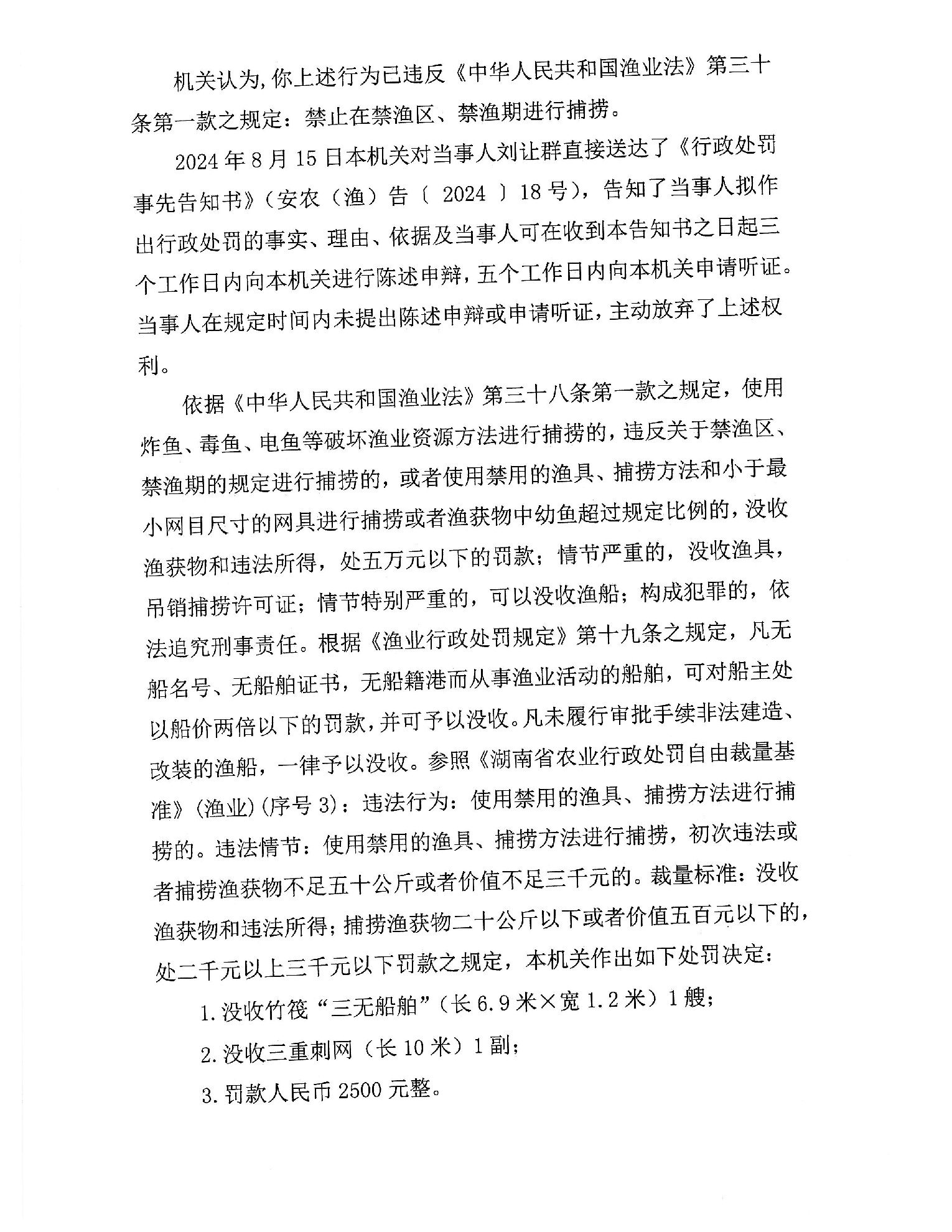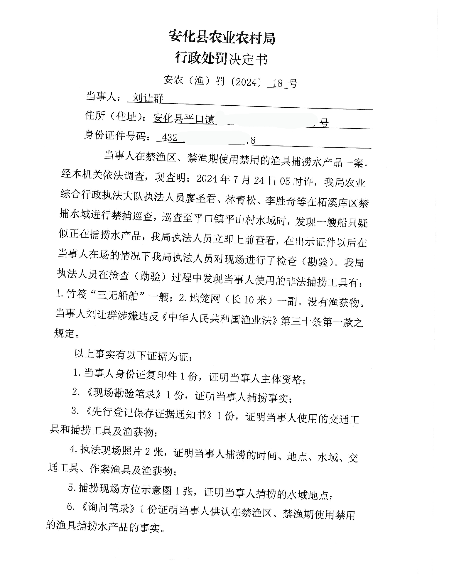 刘让群在禁渔区、禁渔期使用禁用的渔具捕捞水产品一案行政处罚决定书 安农(渔)罚〔2024〕18号
