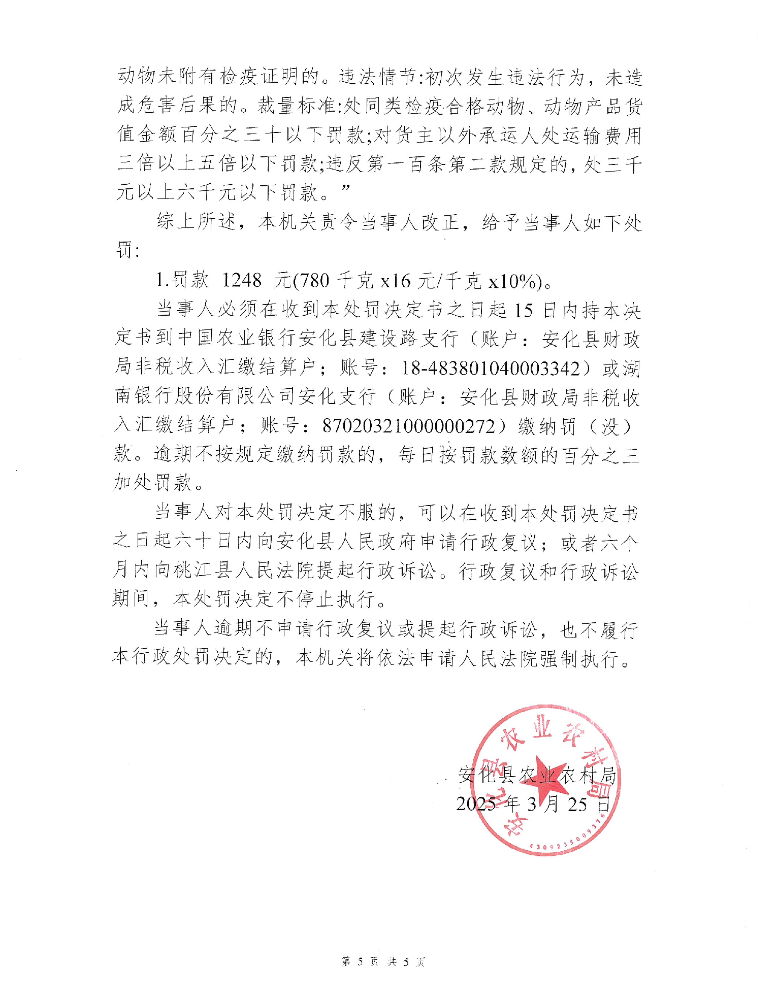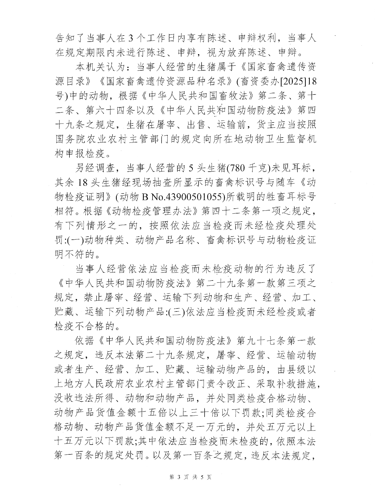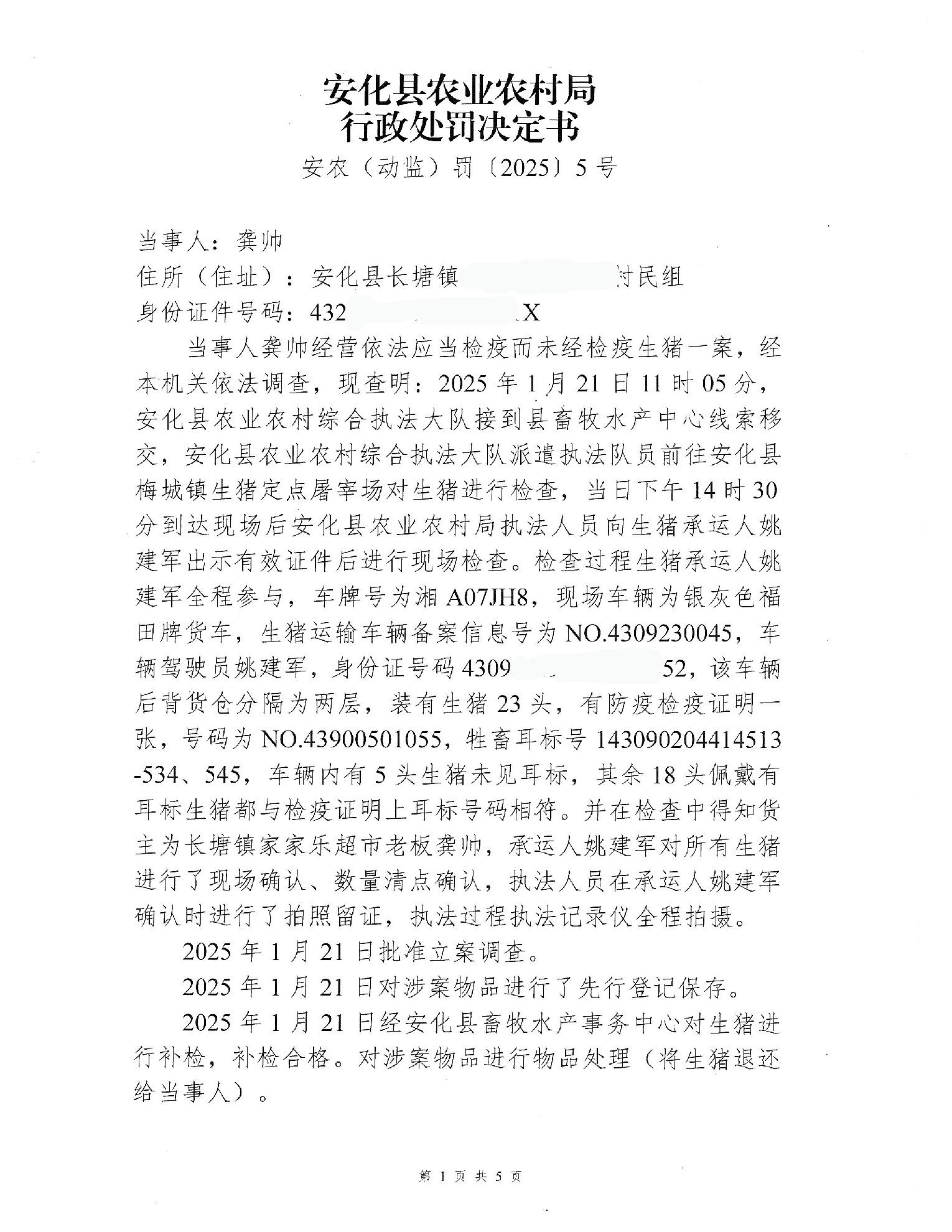 龚帅经营依法应当检疫而未经检疫生猪一案行政处罚决定书 安农(动监)罚〔2025〕5号
