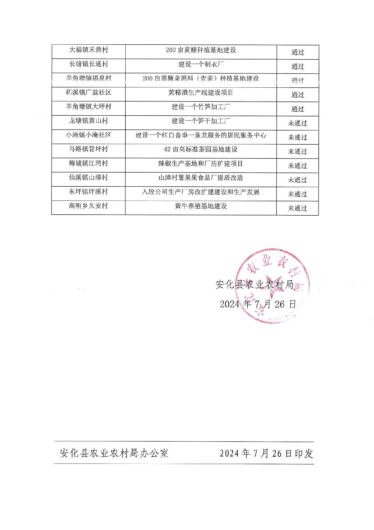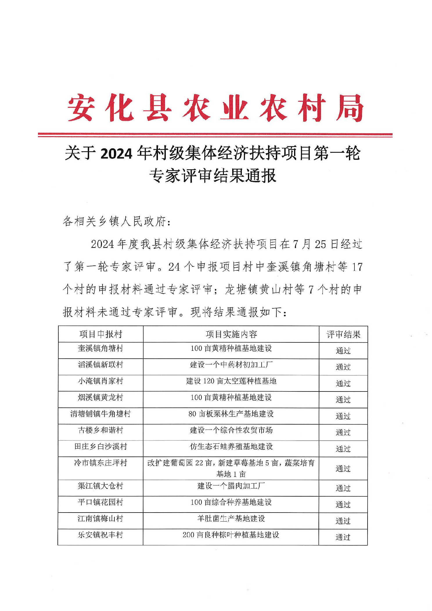 安化县农业农村局关于2024年村级集体经济扶持项目第一轮专家评审结果通报