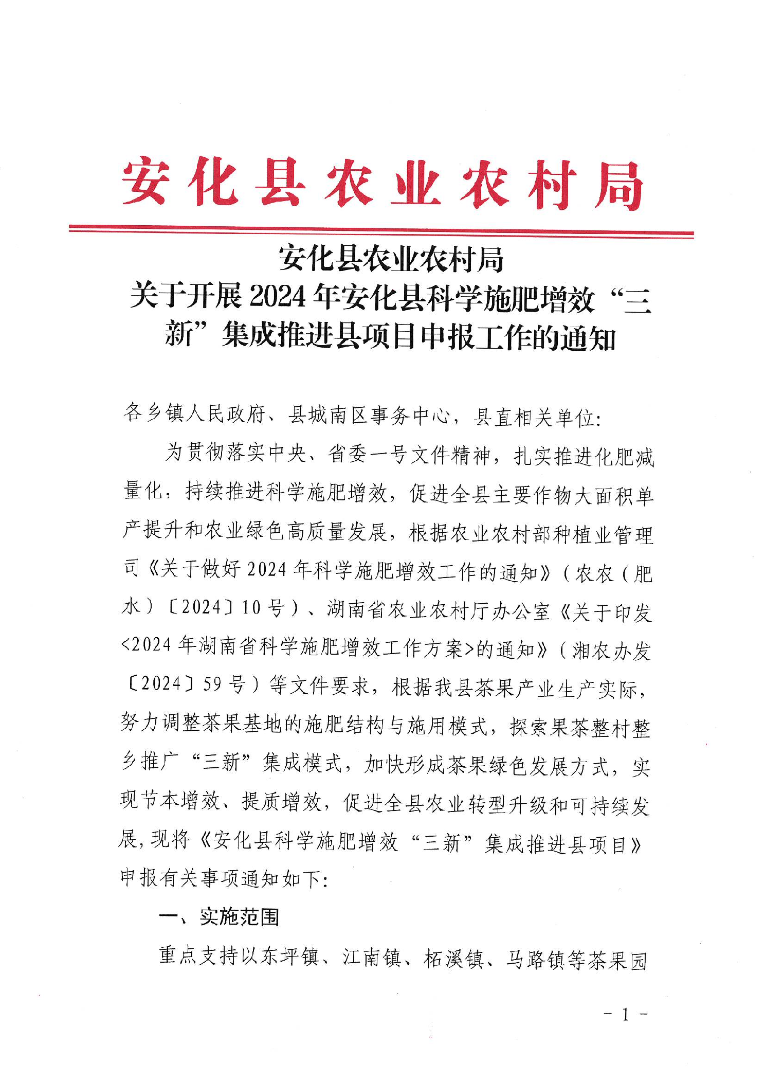 安化县农业农村局 关于开展2024年安化县科学施肥增效“三新”集成推进县项目申报工作的通知