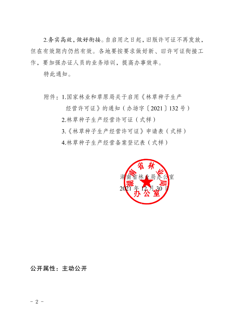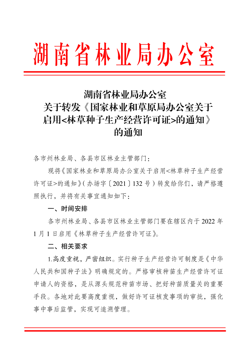 湖南省林业局办公室 关于转发《国家林业和草原局办公室关于 启用林草种子生产经营许可证的通知》 的通知