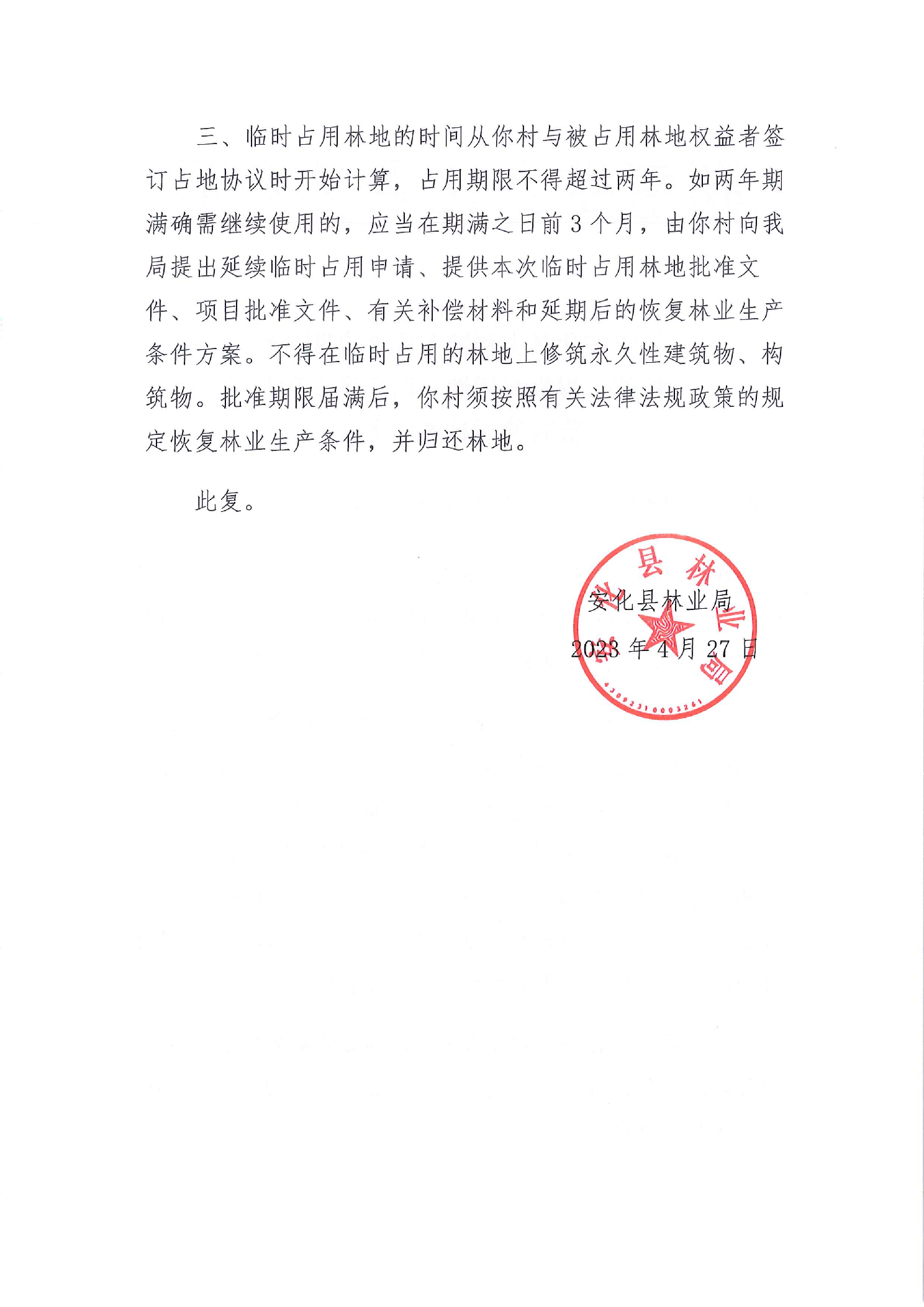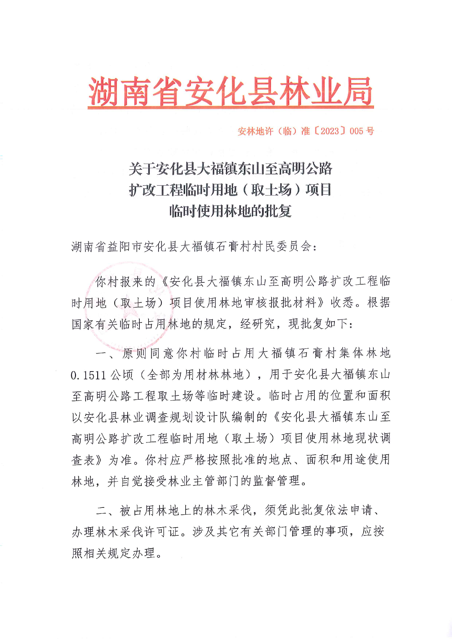 关于安化县大福镇东山至高明公路扩改工程临时用地(取土场)项目临时使用林地的批复公示