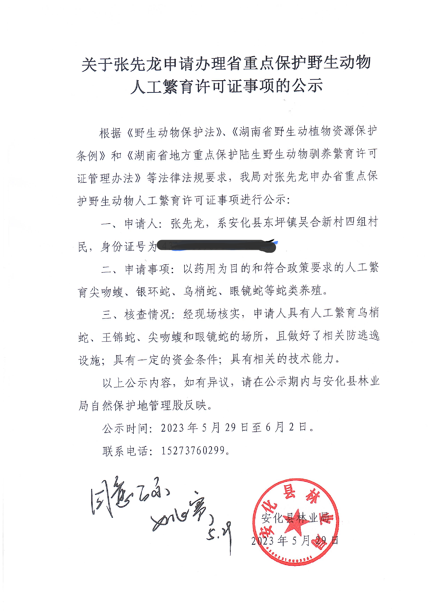 关于张先龙申请办理省重点保护野生动物人工繁育许可证事项的公示