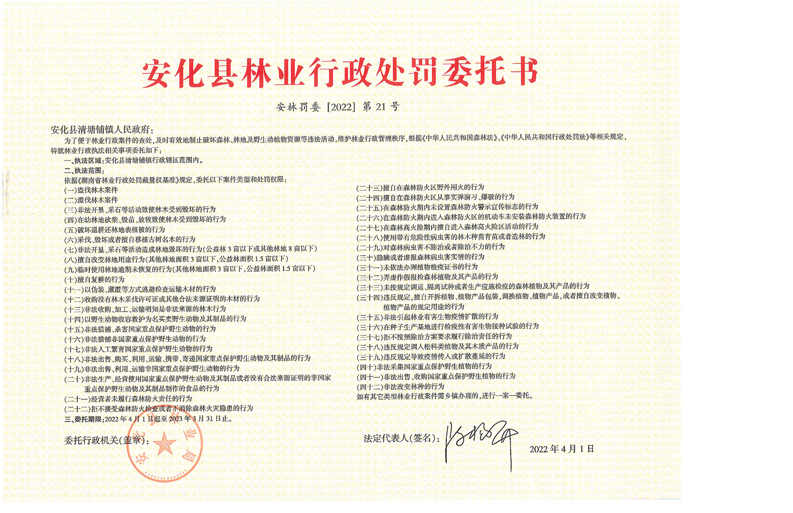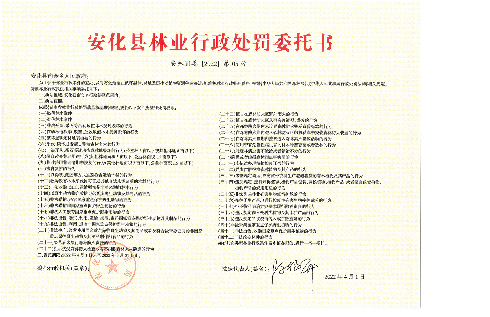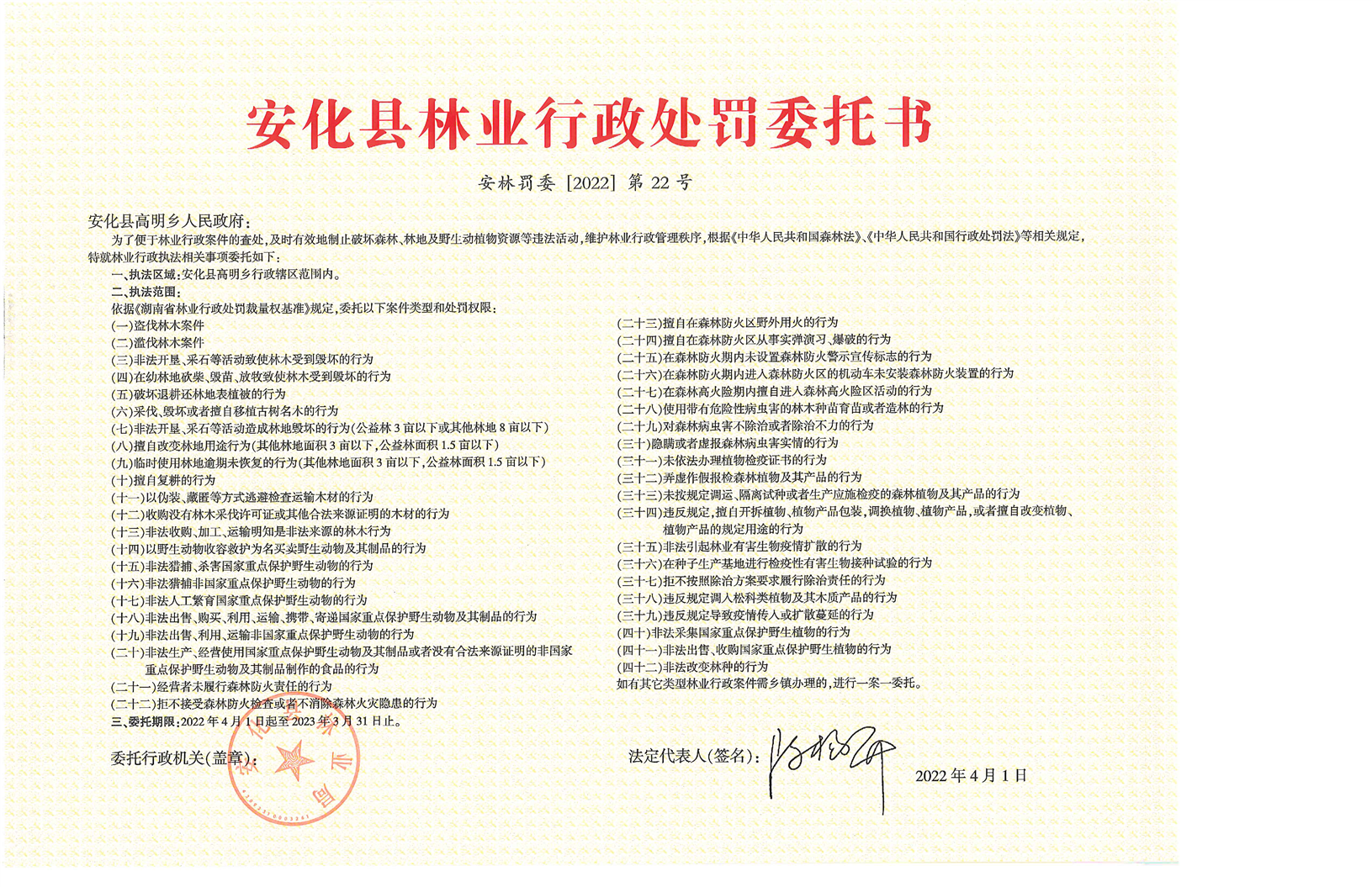 安化县林业行政处罚委托书