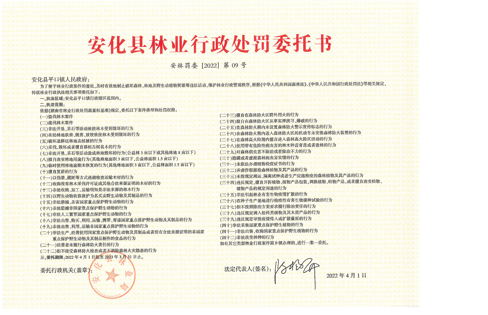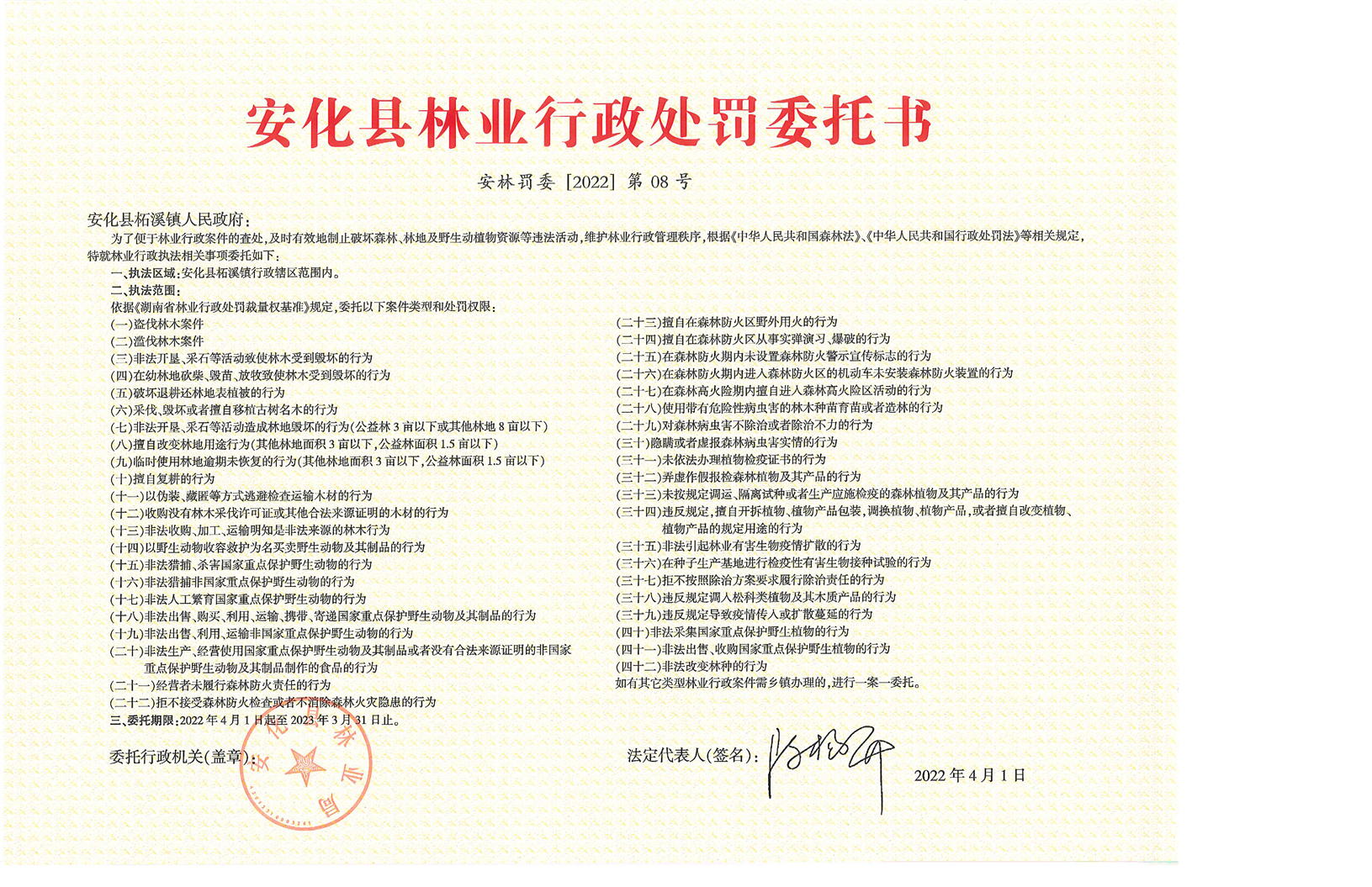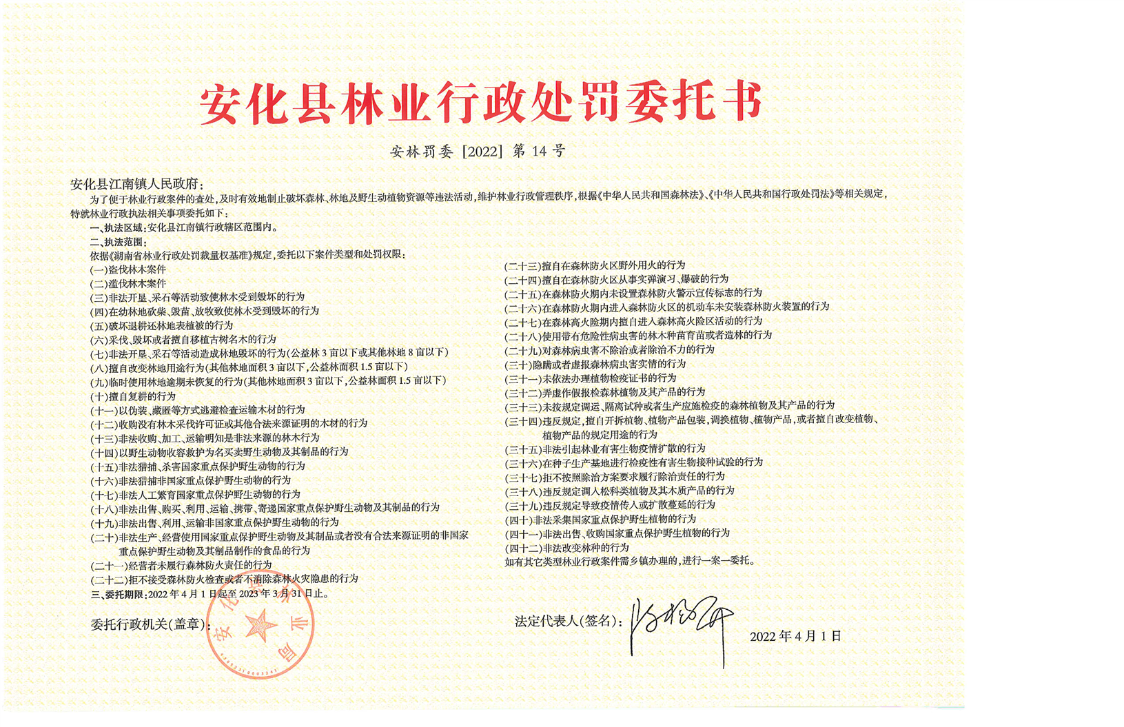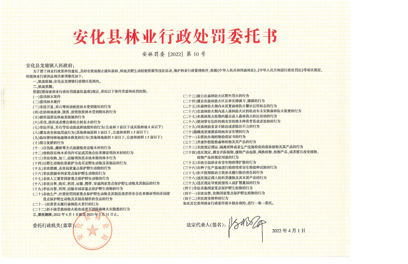 安化县林业行政处罚委托书