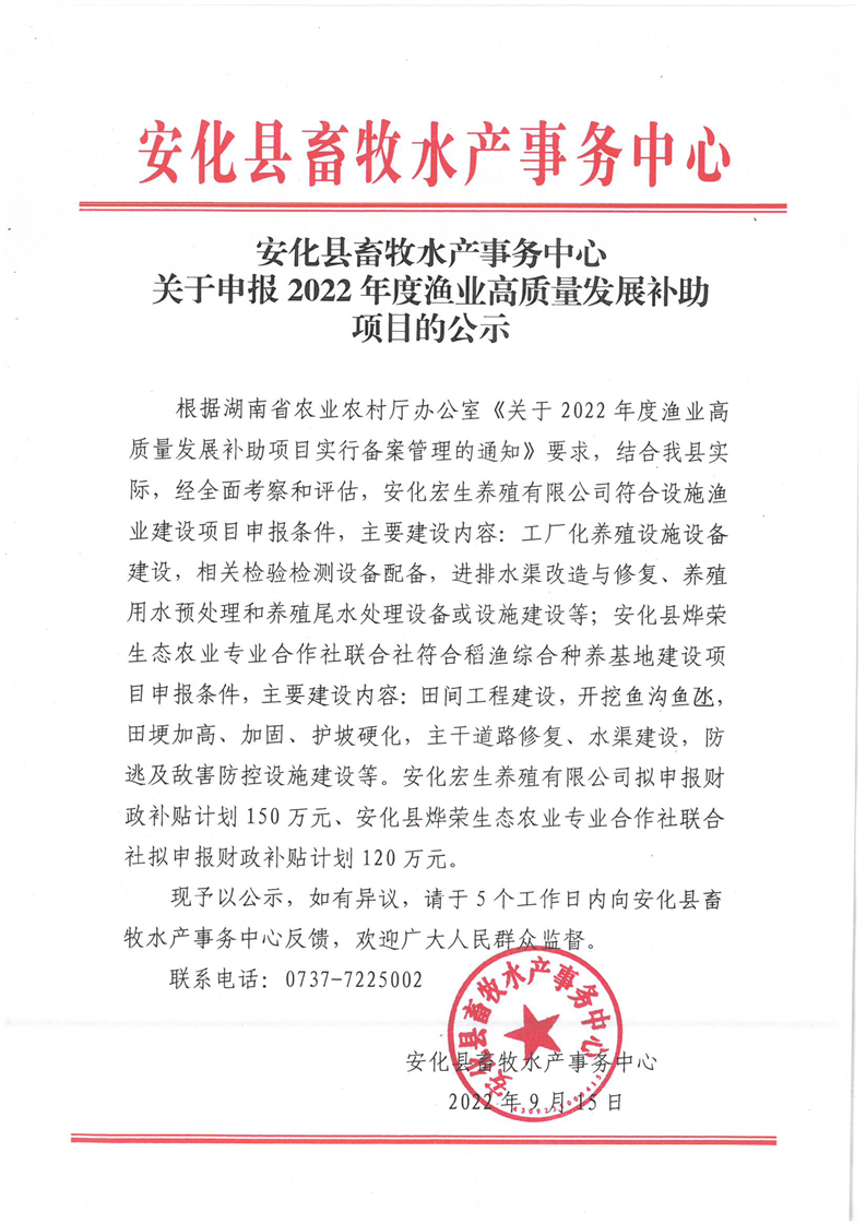 关于申报2022年度渔业高质量发展补助项目的公示