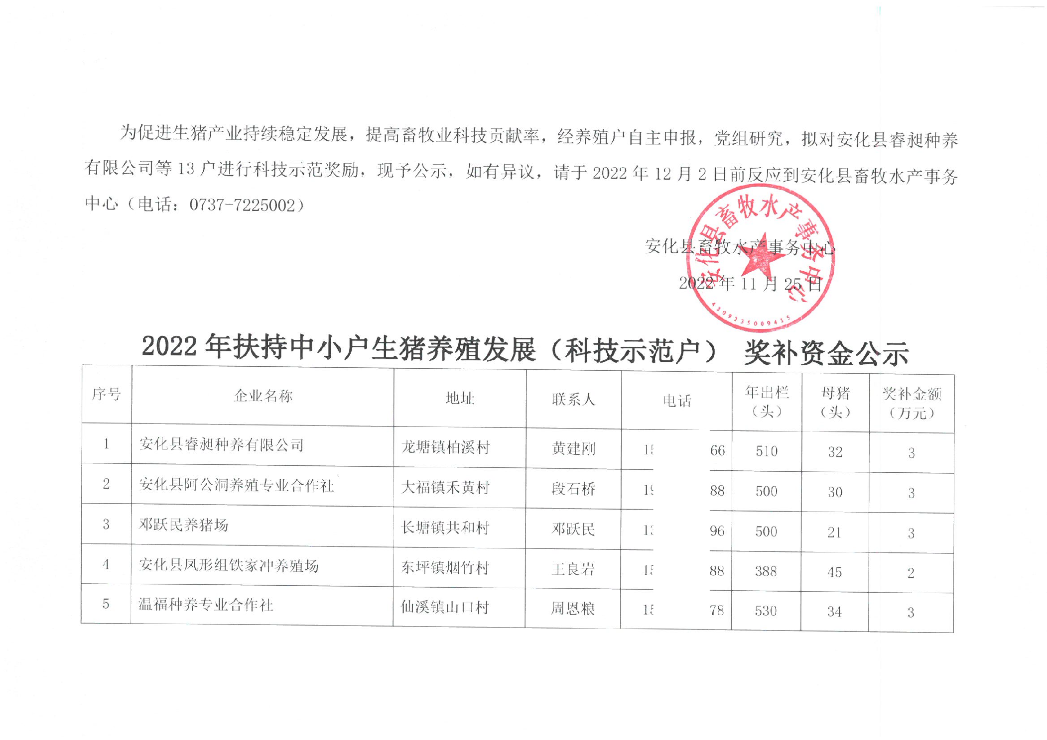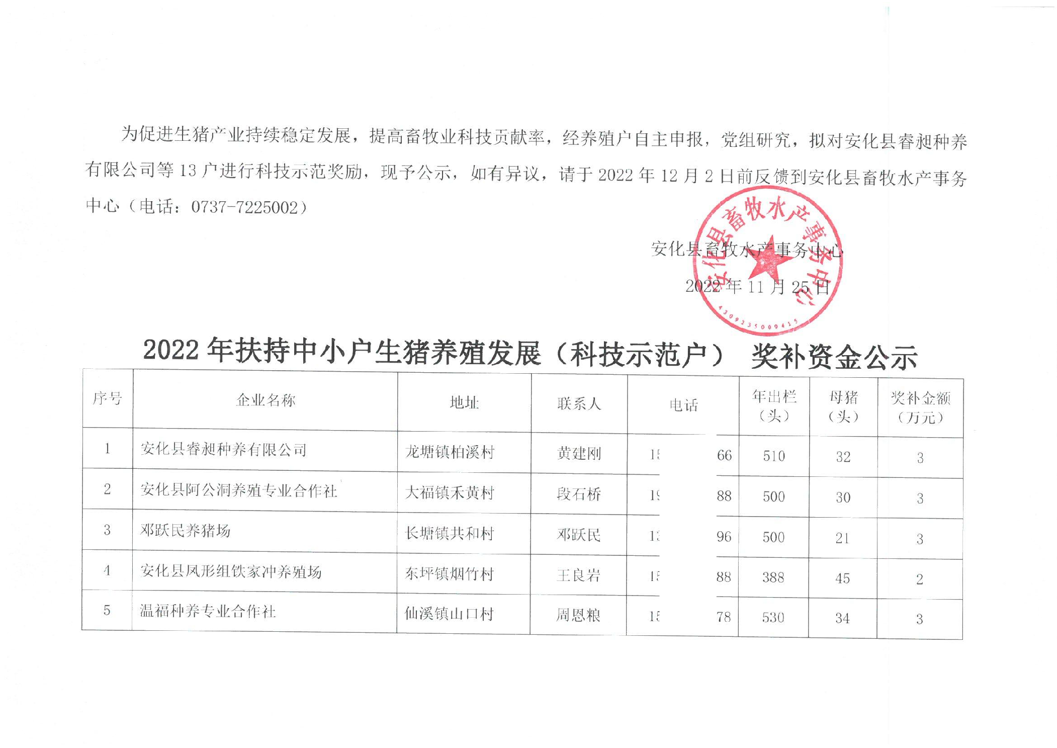 2022年扶持中小户生猪养殖发展(科技示范户)奖补资金