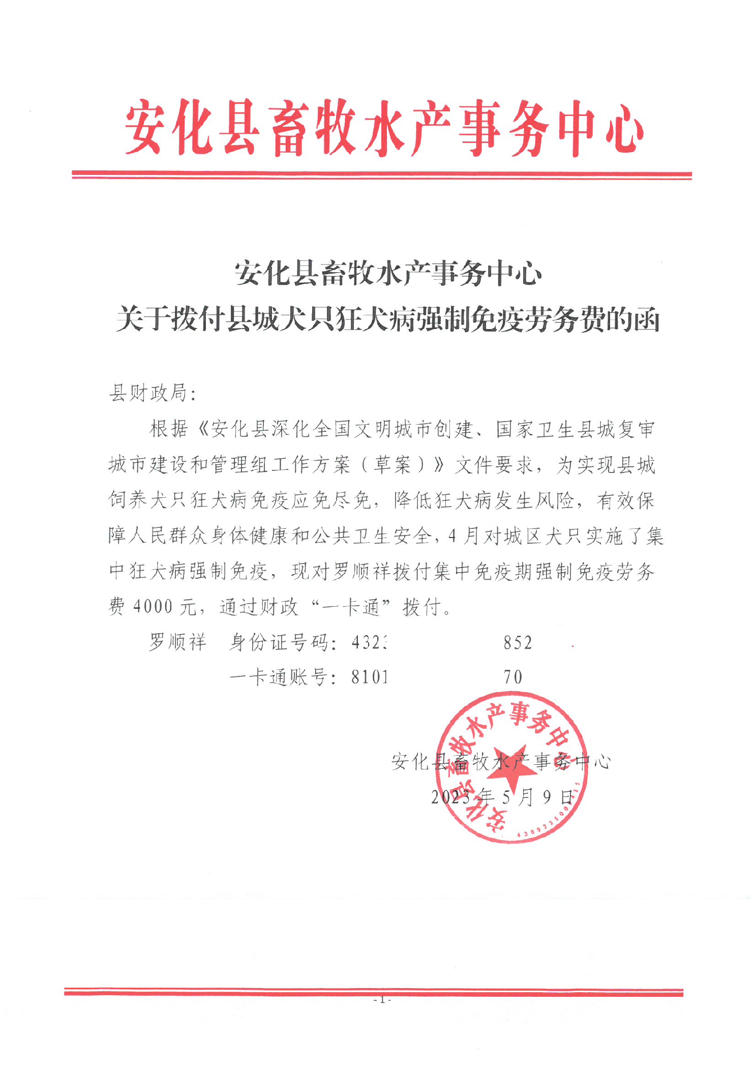 关于拨付县城犬只狂犬病强制免疫劳务费的函