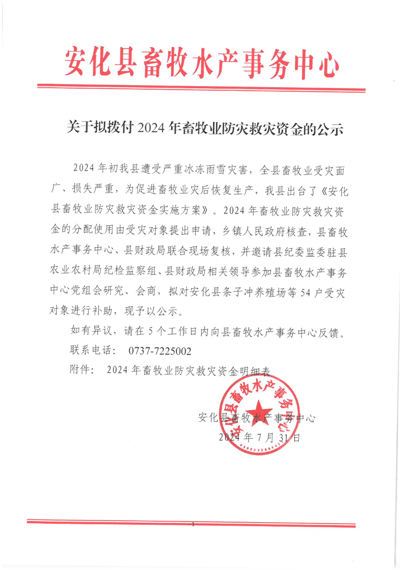 关于拟拨付2024年畜牧业防灾救灾资金的公示